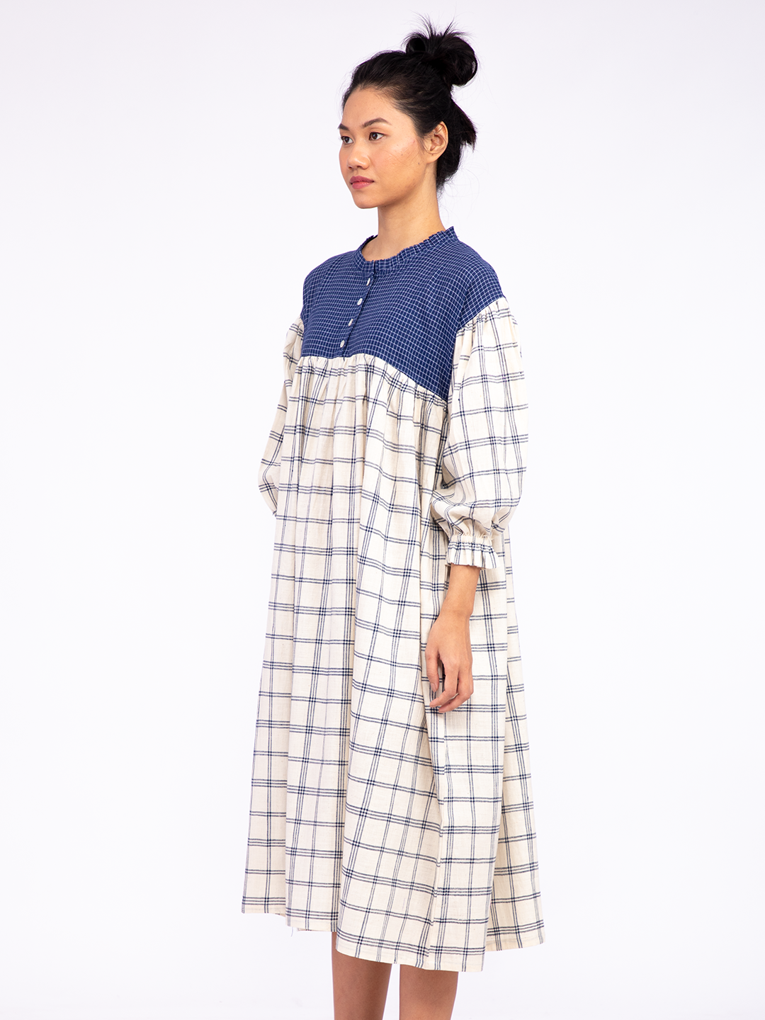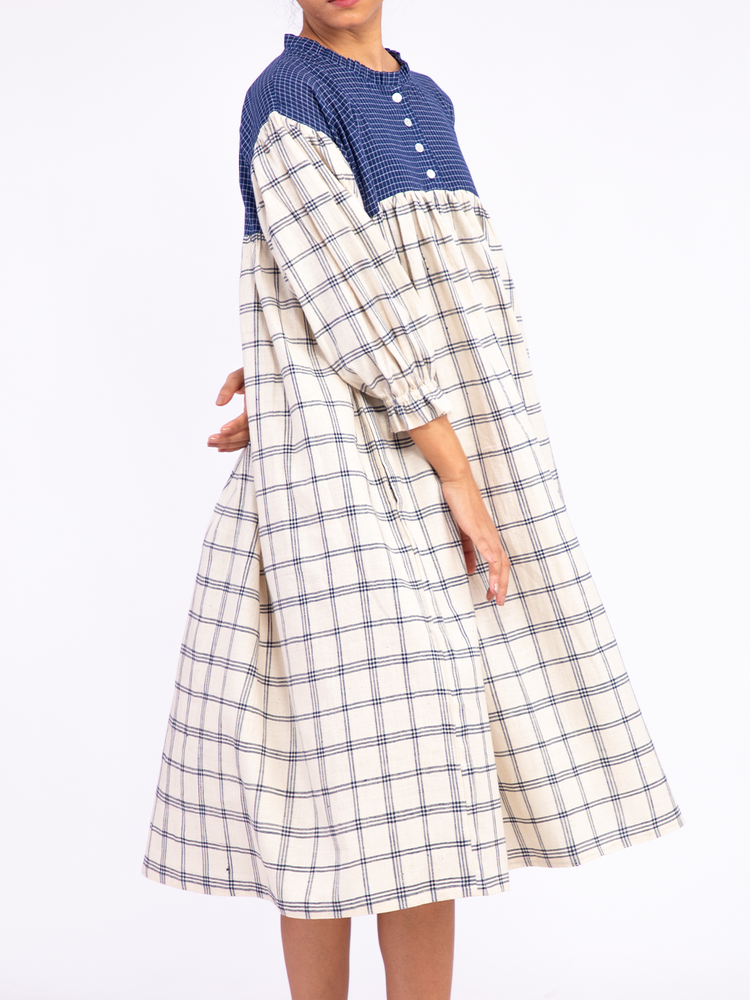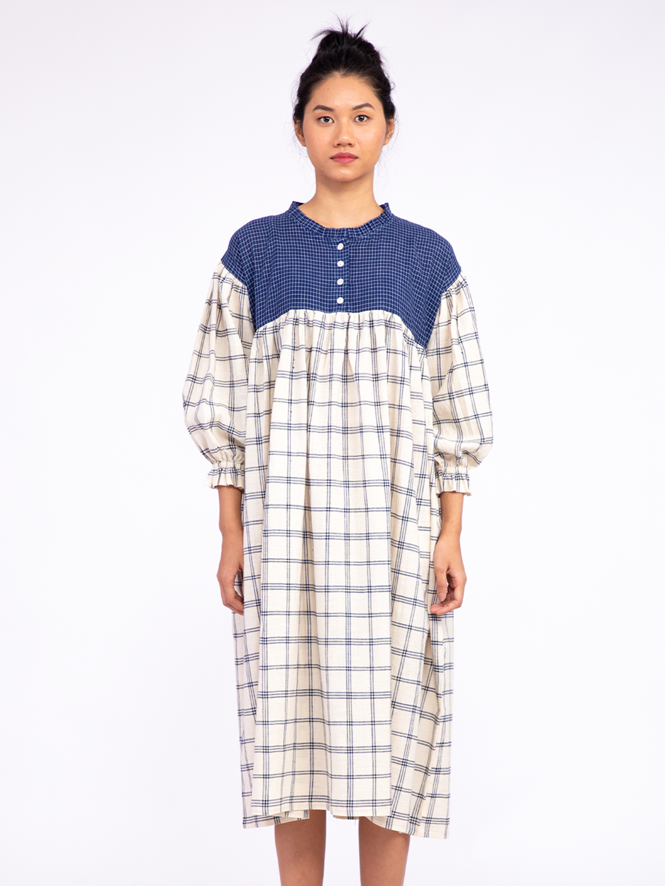A relaxed-fit dress featuring green Katab embroidery on the front panel, meticulously handcrafted by women from the Dhevariya Rabari community in an Indian village. The side panels are made from indigenous organic cotton, offering both comfort and sustainability. This dress brings together traditional craftsmanship and modern design for an understated, natural look.