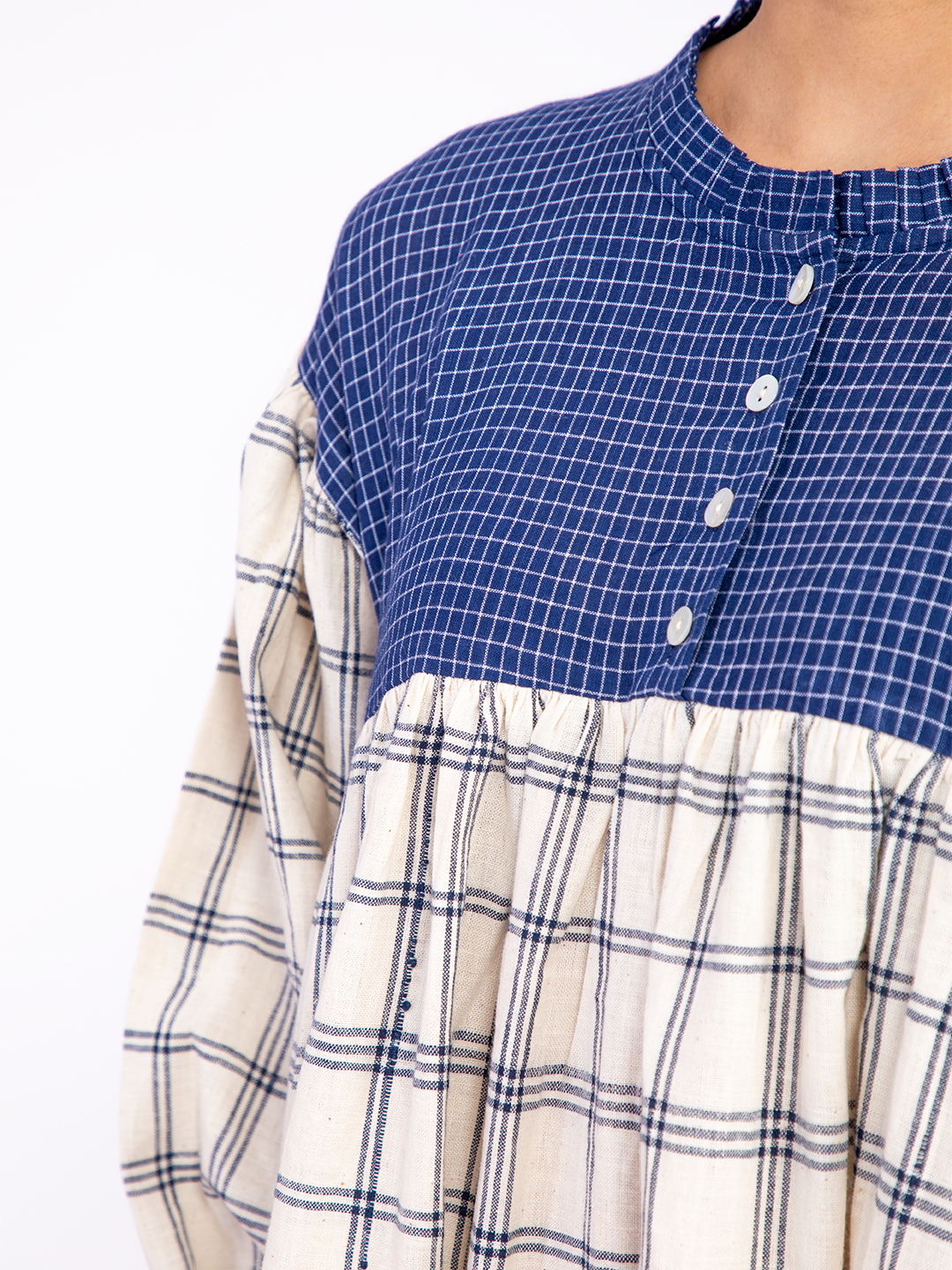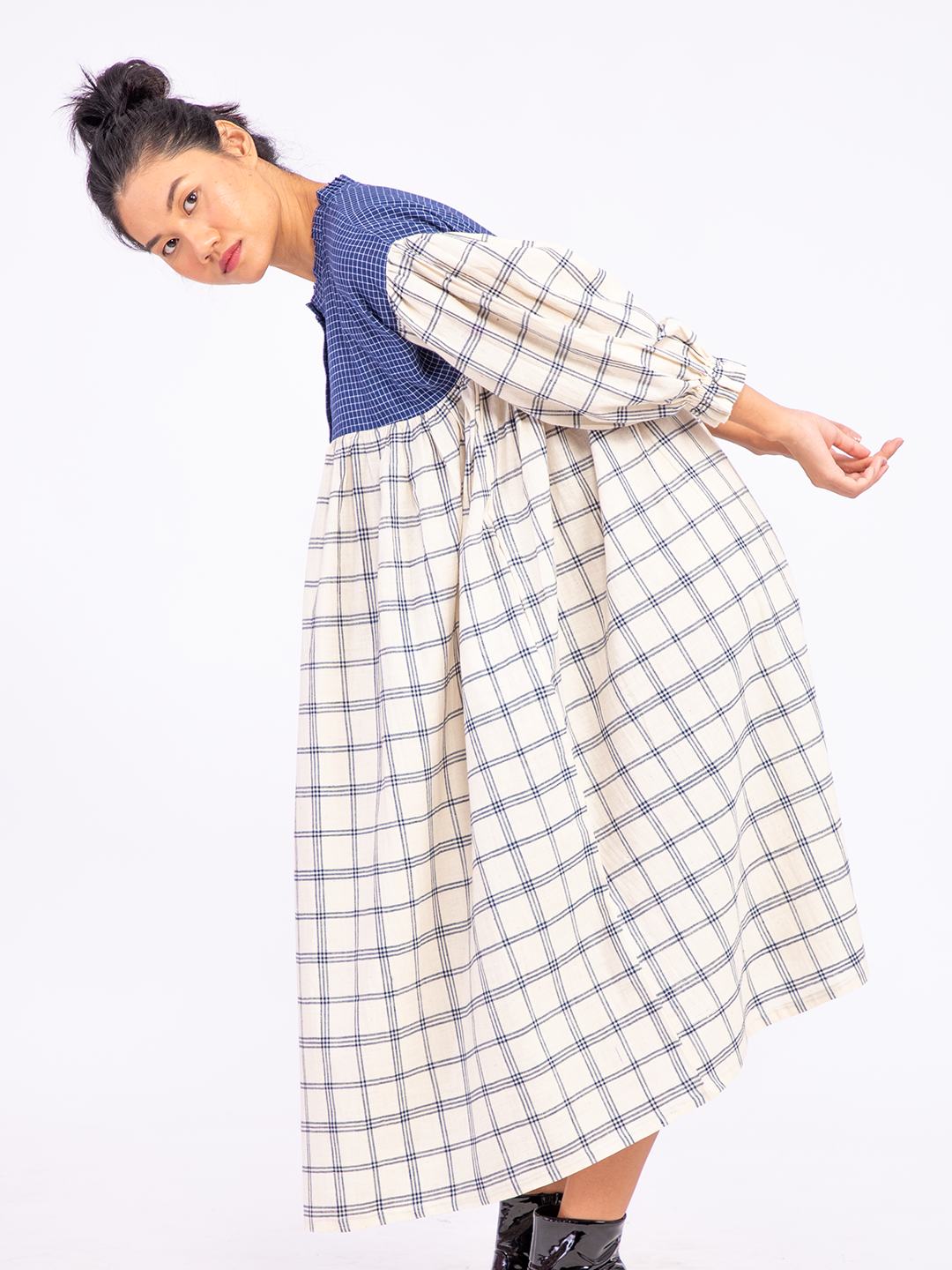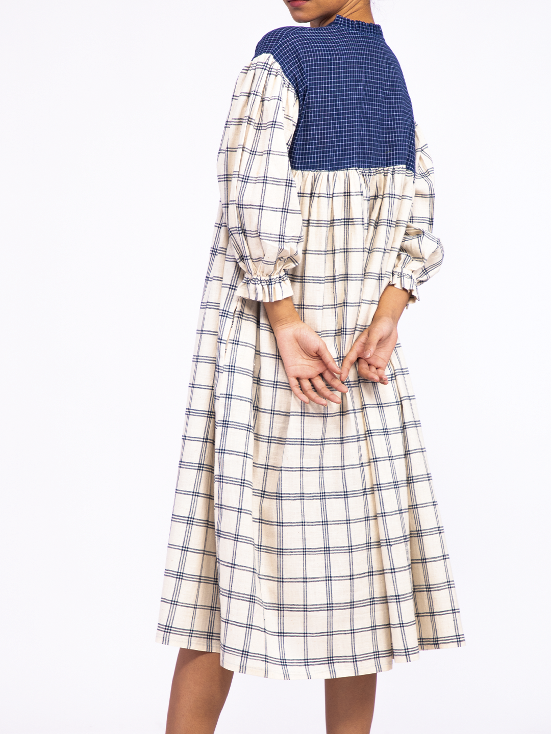 A relaxed-fit dress featuring green Katab embroidery on the front panel, meticulously handcrafted by women from the Dhevariya Rabari community in an Indian village. The side panels are made from indigenous organic cotton, offering both comfort and sustainability. This dress brings together traditional craftsmanship and modern design for an understated, natural look.