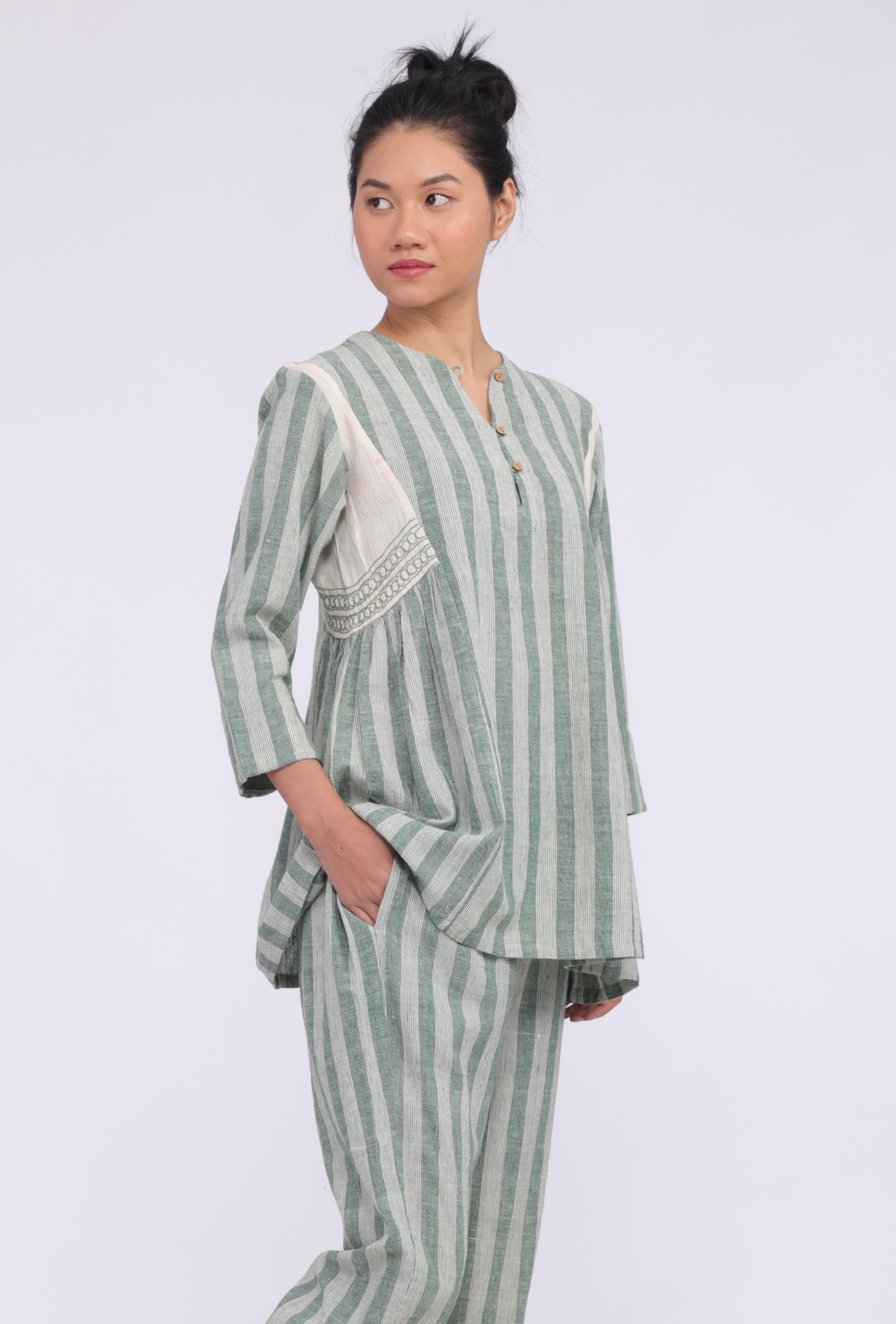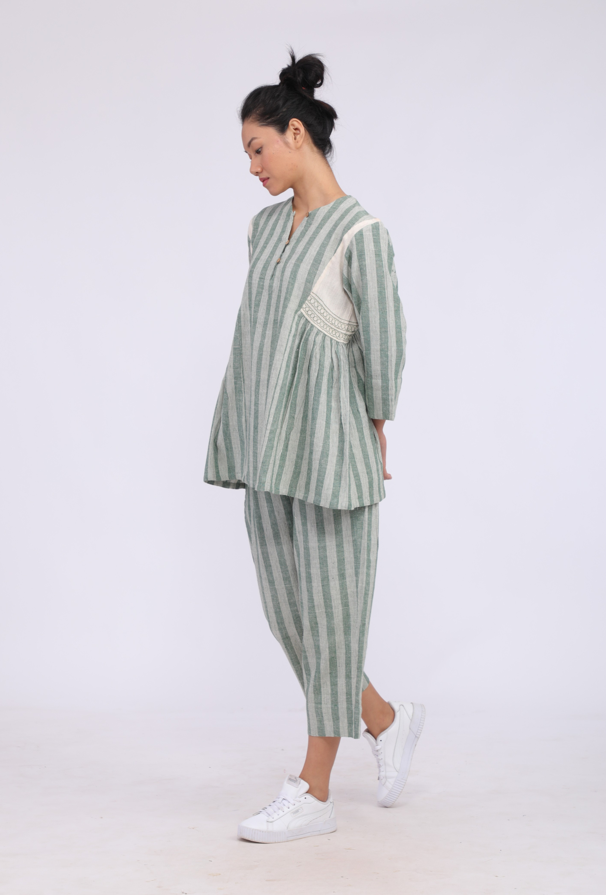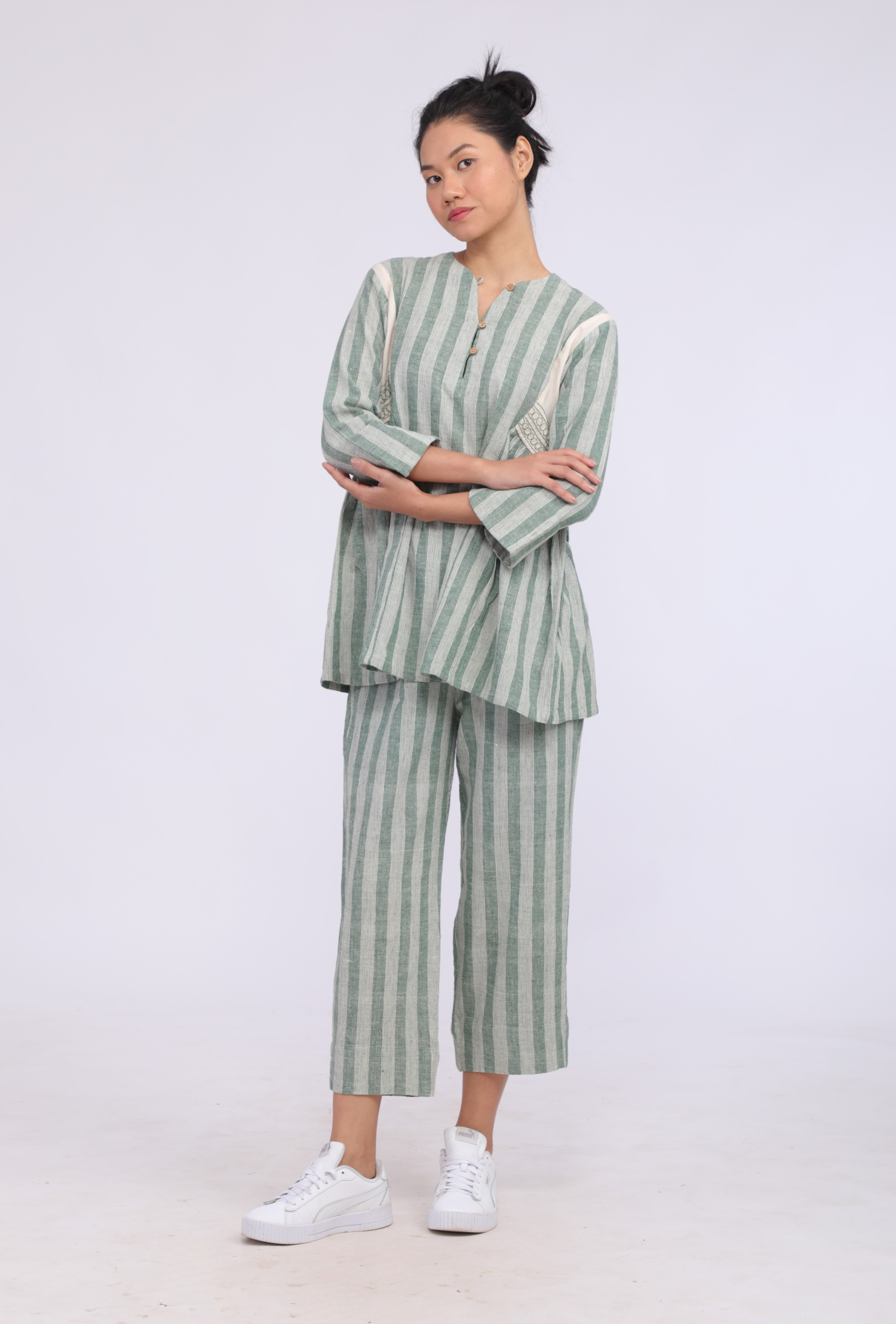 This cord set is crafted from yarn-dyed handwoven fabric featuring bold green and off-white stripes, originating from the Kutch region of India. The top has a relaxed silhouette with a gathered waist and is highlighted by intricate Aahir embroidery on the side panel, done by women artisans of the Aahir community. The 3/4 sleeves add a touch of casual sophistication, while the notch neckline gives it a contemporary edge. Paired with cropped, straight-fit trousers, this set offers a blend of comfort and style.