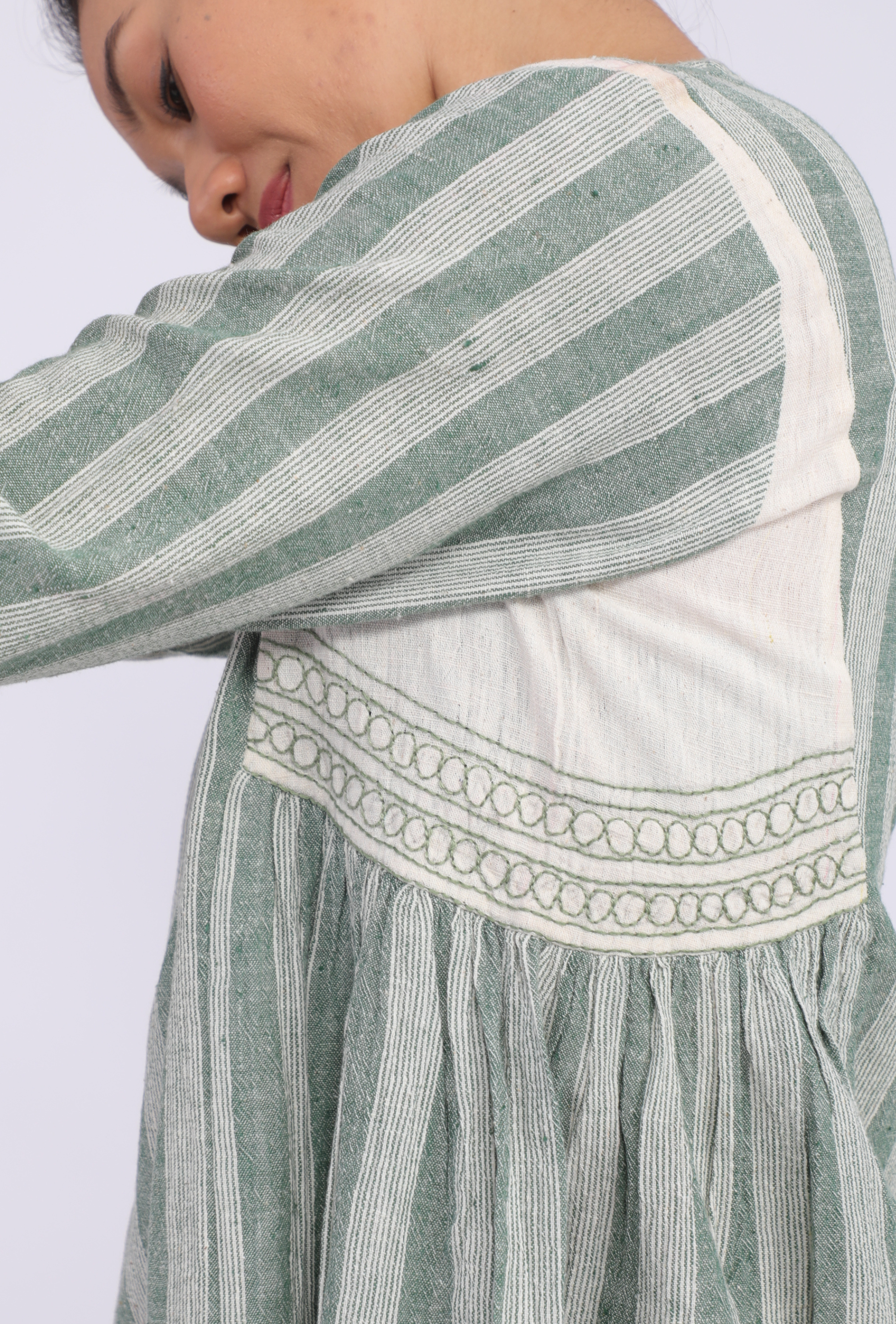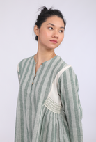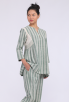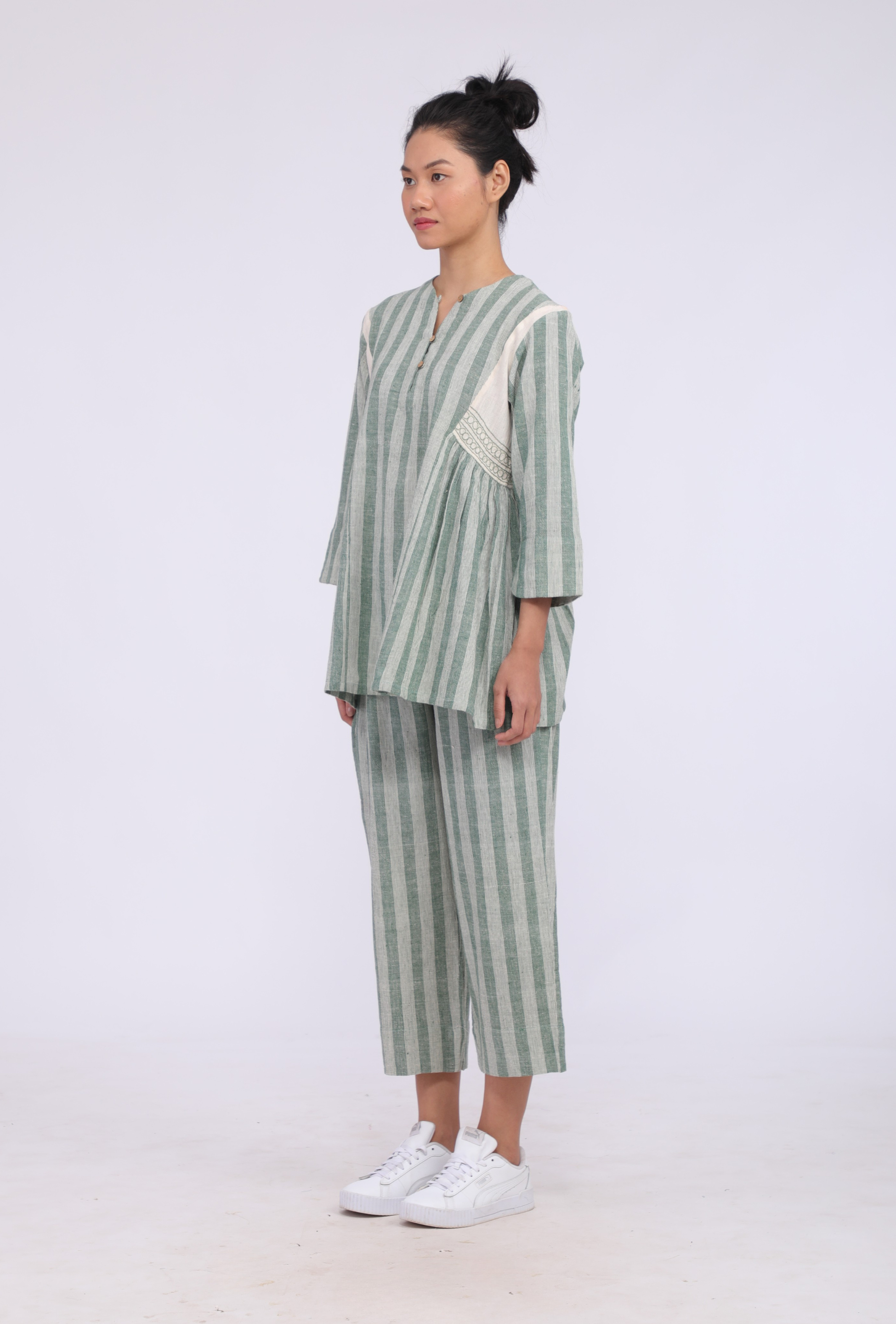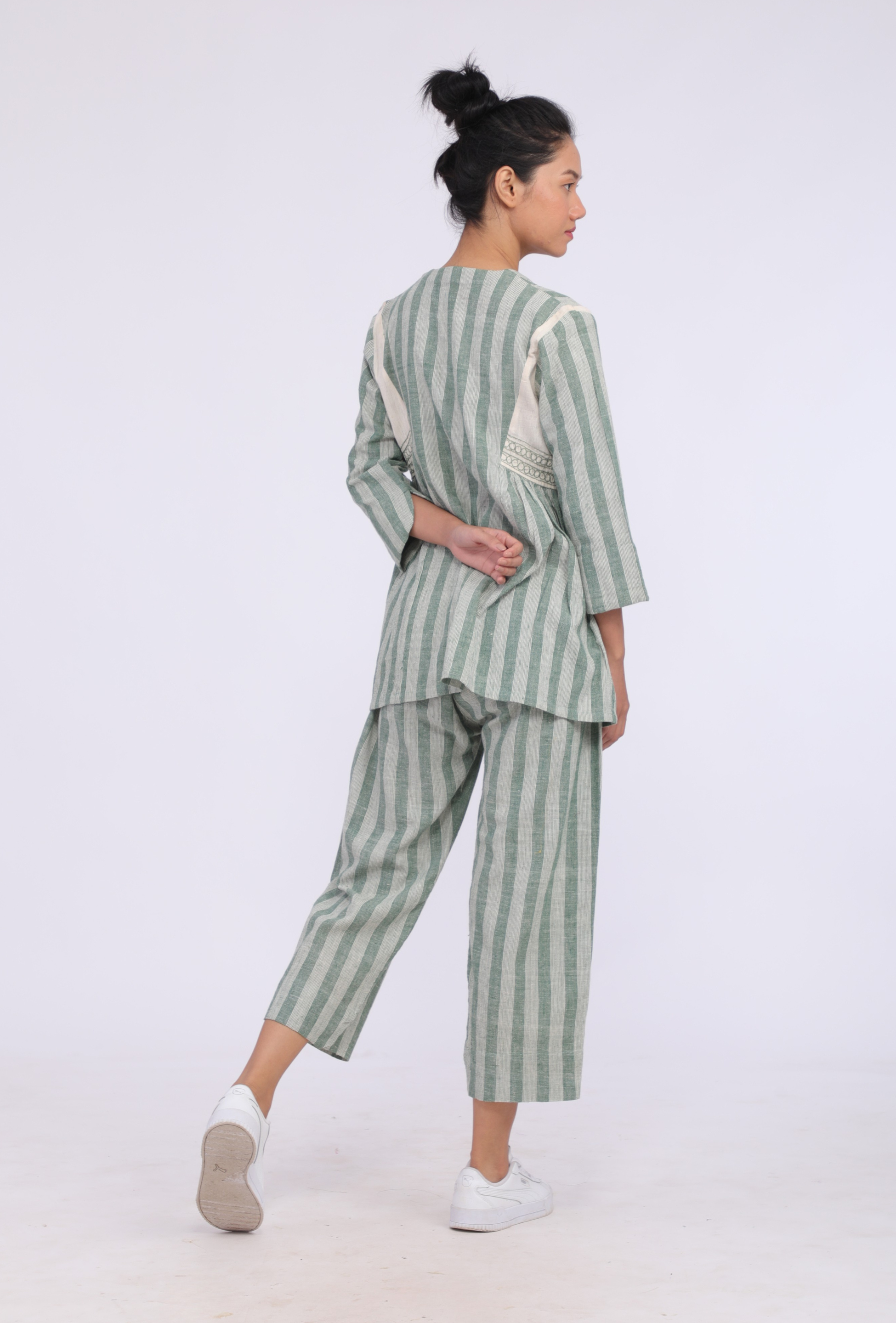 This cord set is crafted from yarn-dyed handwoven fabric featuring bold green and off-white stripes, originating from the Kutch region of India. The top has a relaxed silhouette with a gathered waist and is highlighted by intricate Aahir embroidery on the side panel, done by women artisans of the Aahir community. The 3/4 sleeves add a touch of casual sophistication, while the notch neckline gives it a contemporary edge. Paired with cropped, straight-fit trousers, this set offers a blend of comfort and style.
