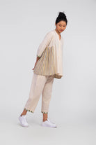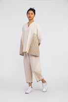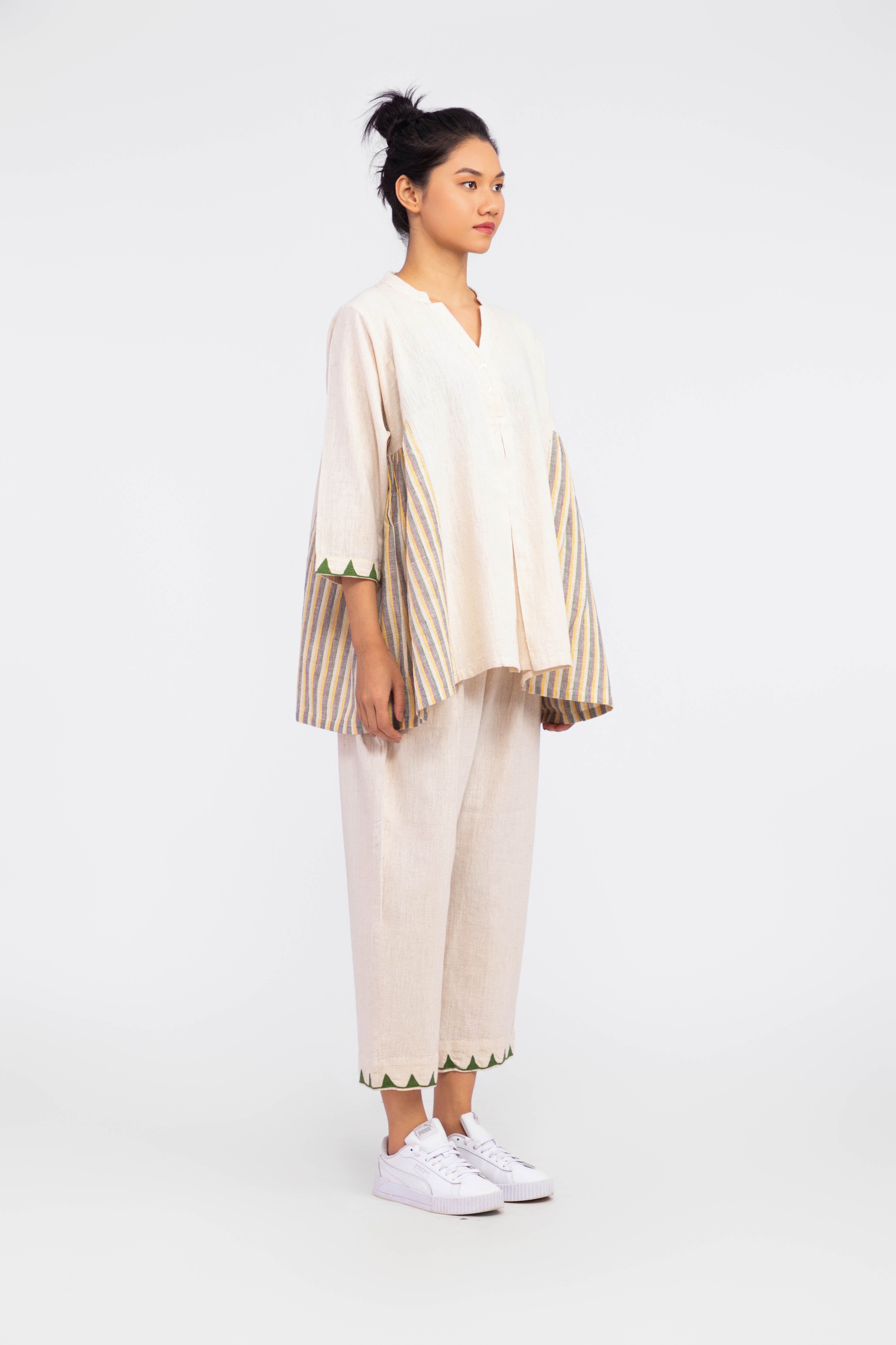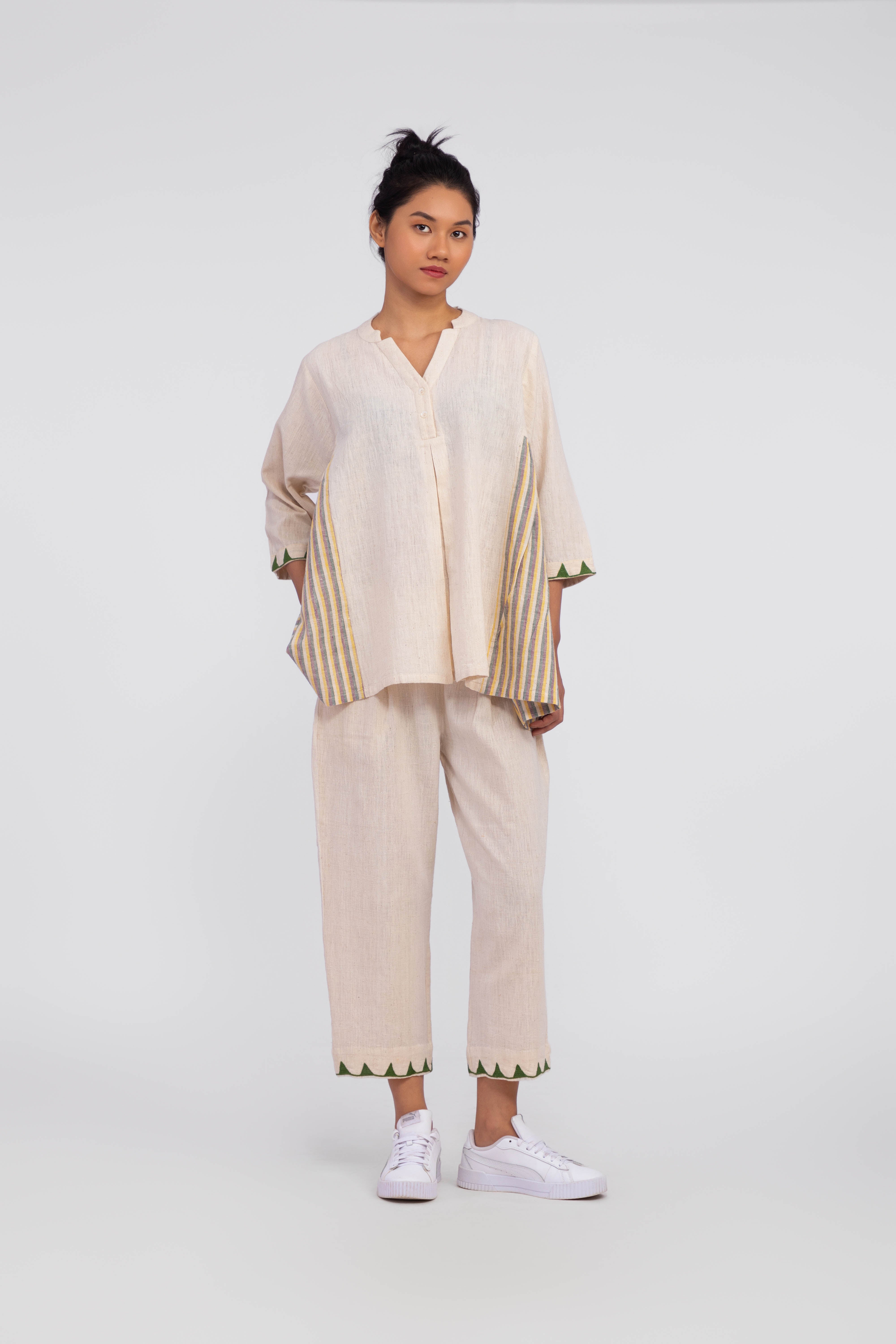 This cord set is made from 100% organic cotton, featuring a handwoven beige tone. The top has a soft pleated neckline with a relaxed silhouette and uses yarn-dye handloom fabric for the side panel gathering. Intricate Tunari hand embroidery details are added to the hemline for a touch of artisanal craftsmanship. The 3/4 sleeves offer a casual yet refined feel, while the cropped, straight-leg trousers provide an elegant blend of comfort and style.
