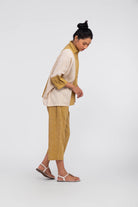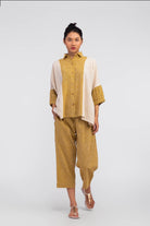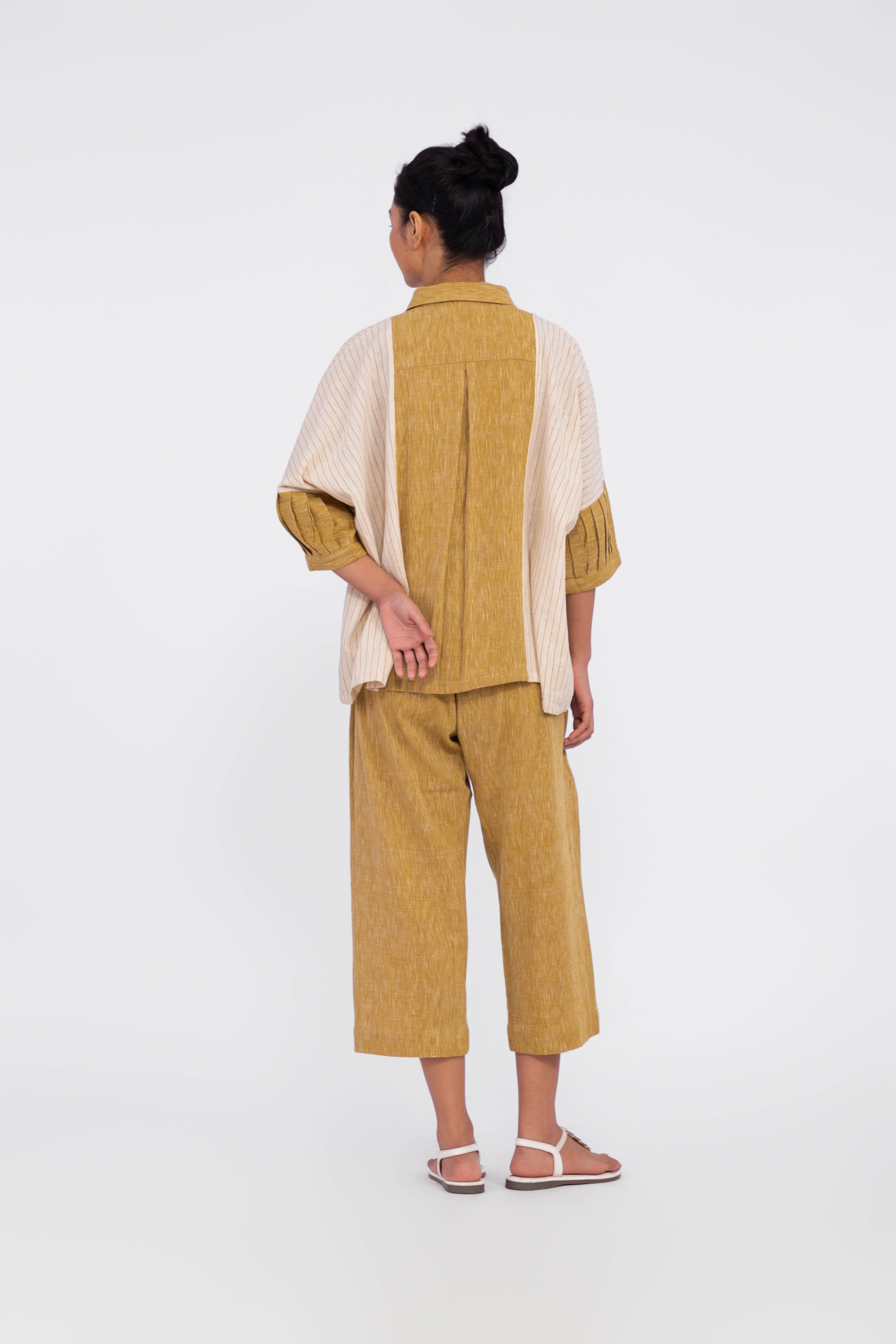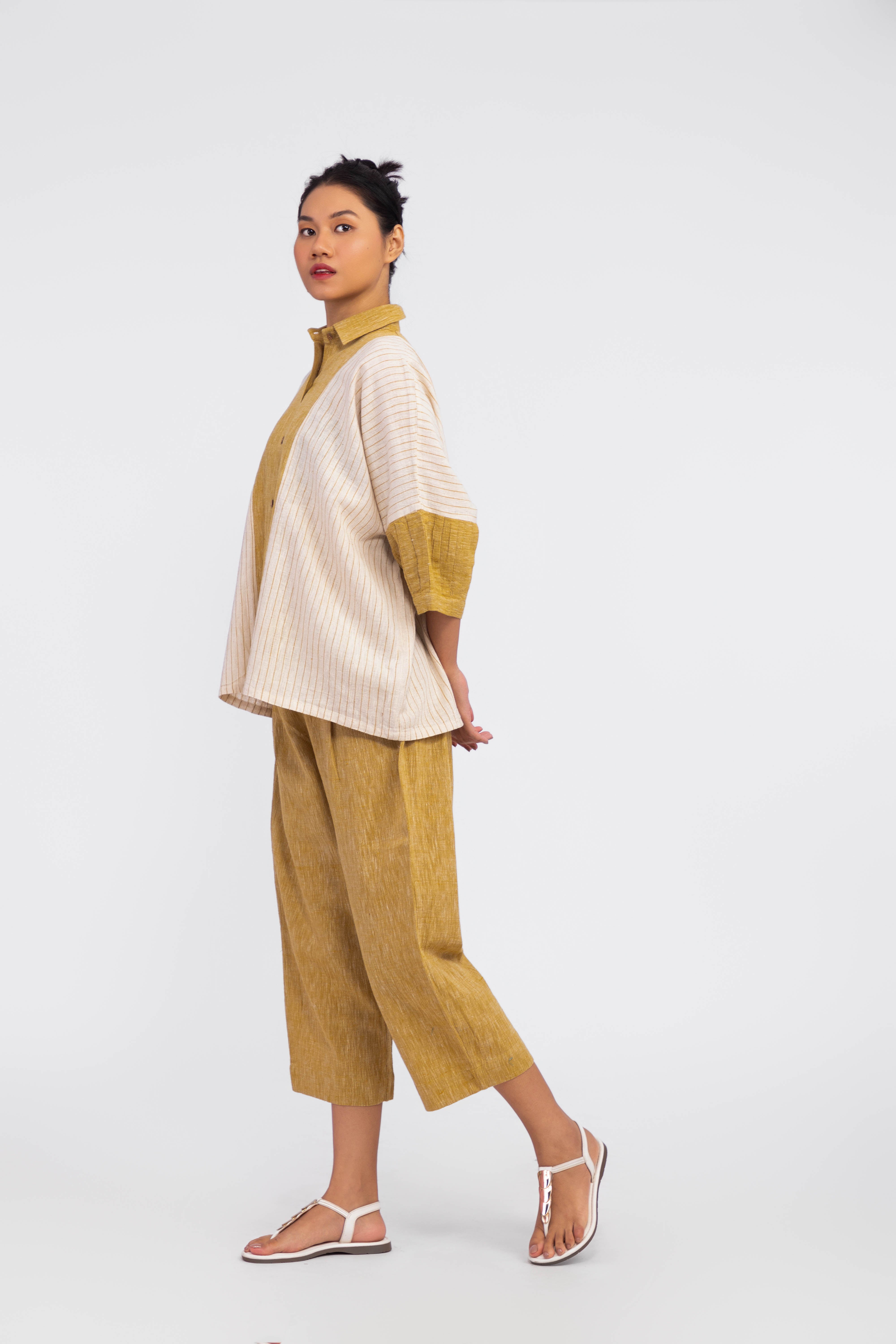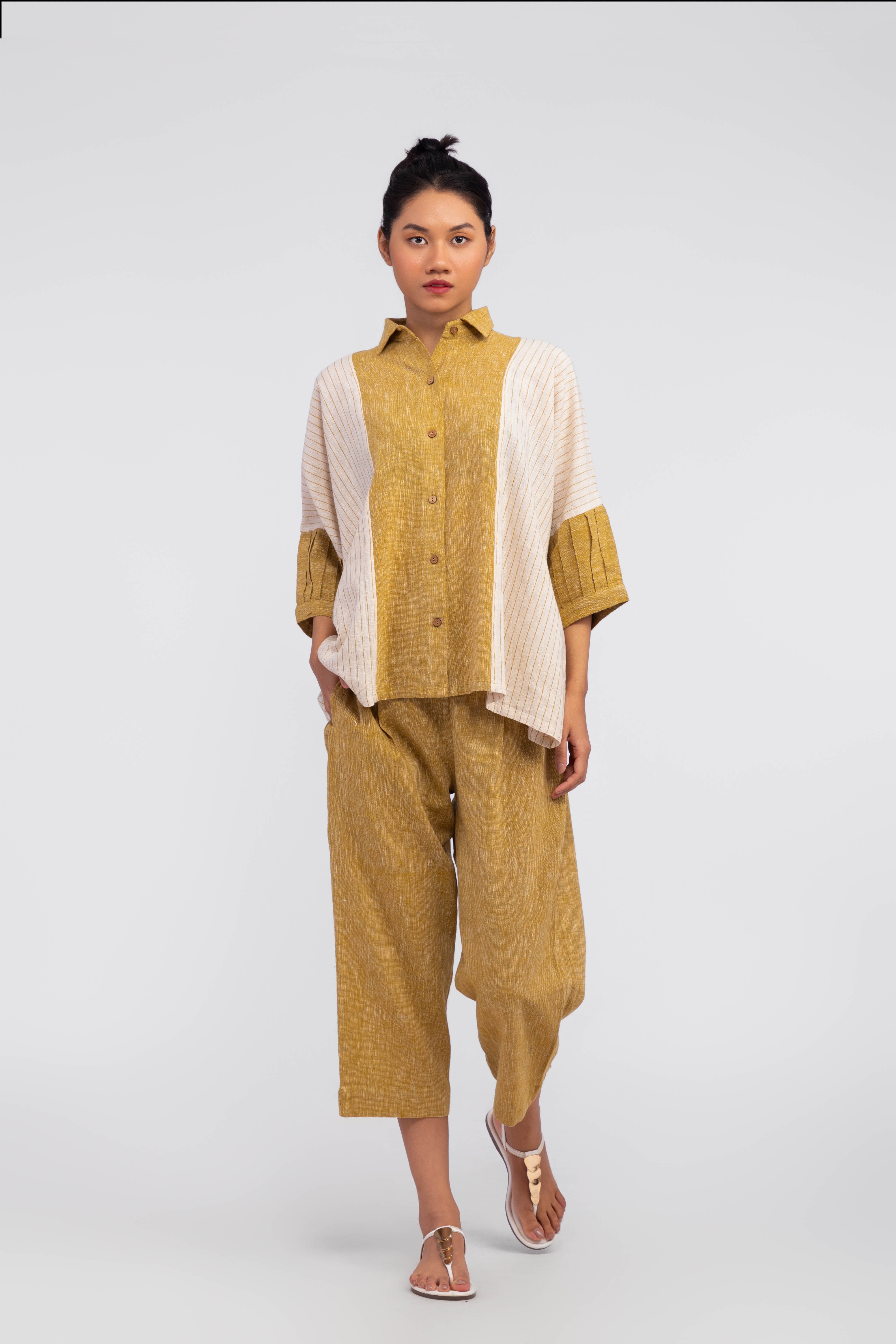 This two-piece cord set is crafted from indigenous Kala cotton, handwoven by artisans in the Kutch region of India. Featuring a natural beige base and yarn-dyed mustard tones, the set includes a band collar shirt with oversized sleeves and cropped pants. The naturally dyed mustard color adds a warm, earthy touch, while the relaxed silhouette ensures effortless, modern style. This sustainable set offers both versatility and a timeless look, celebrating the authenticity of Kala cotton.