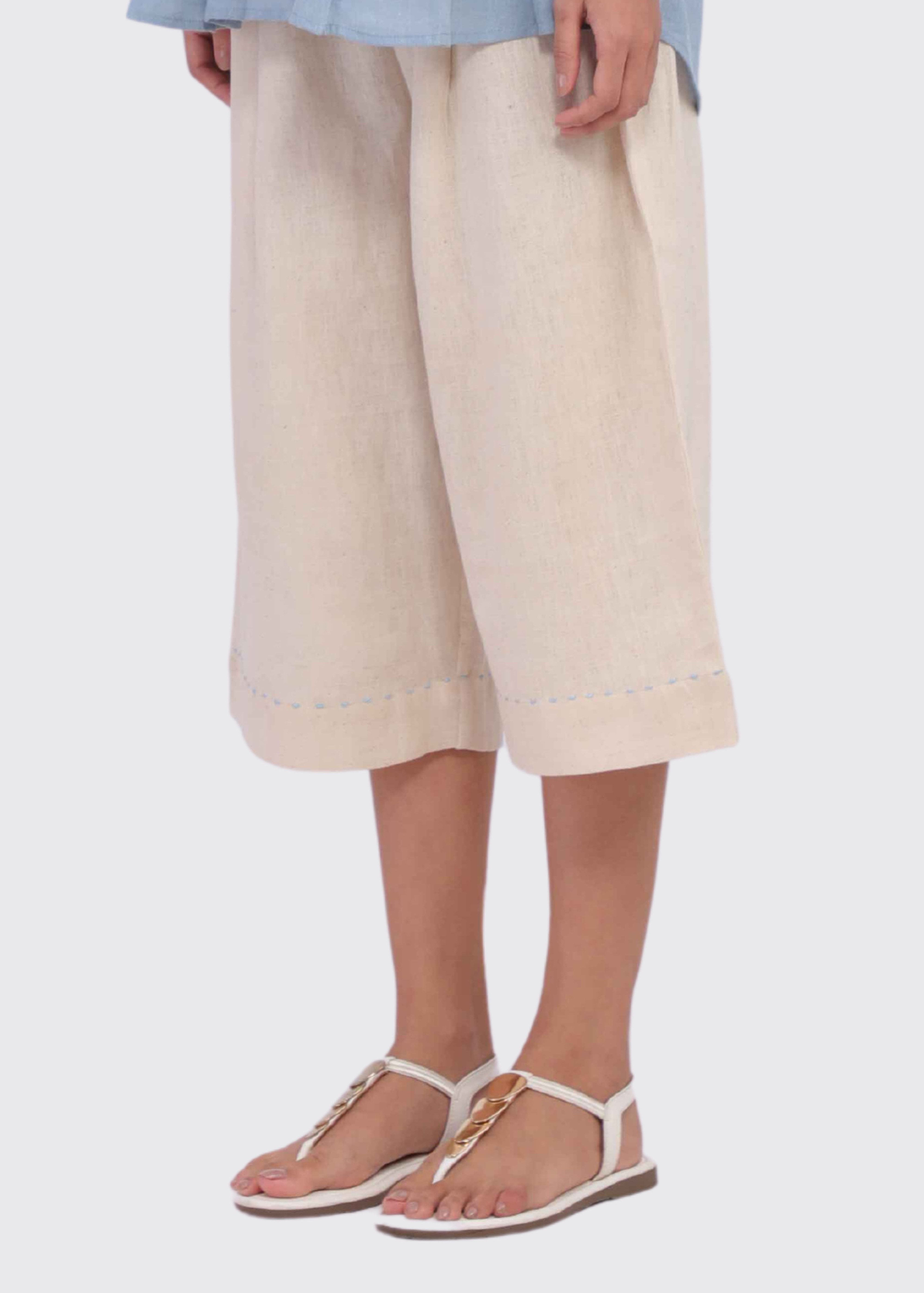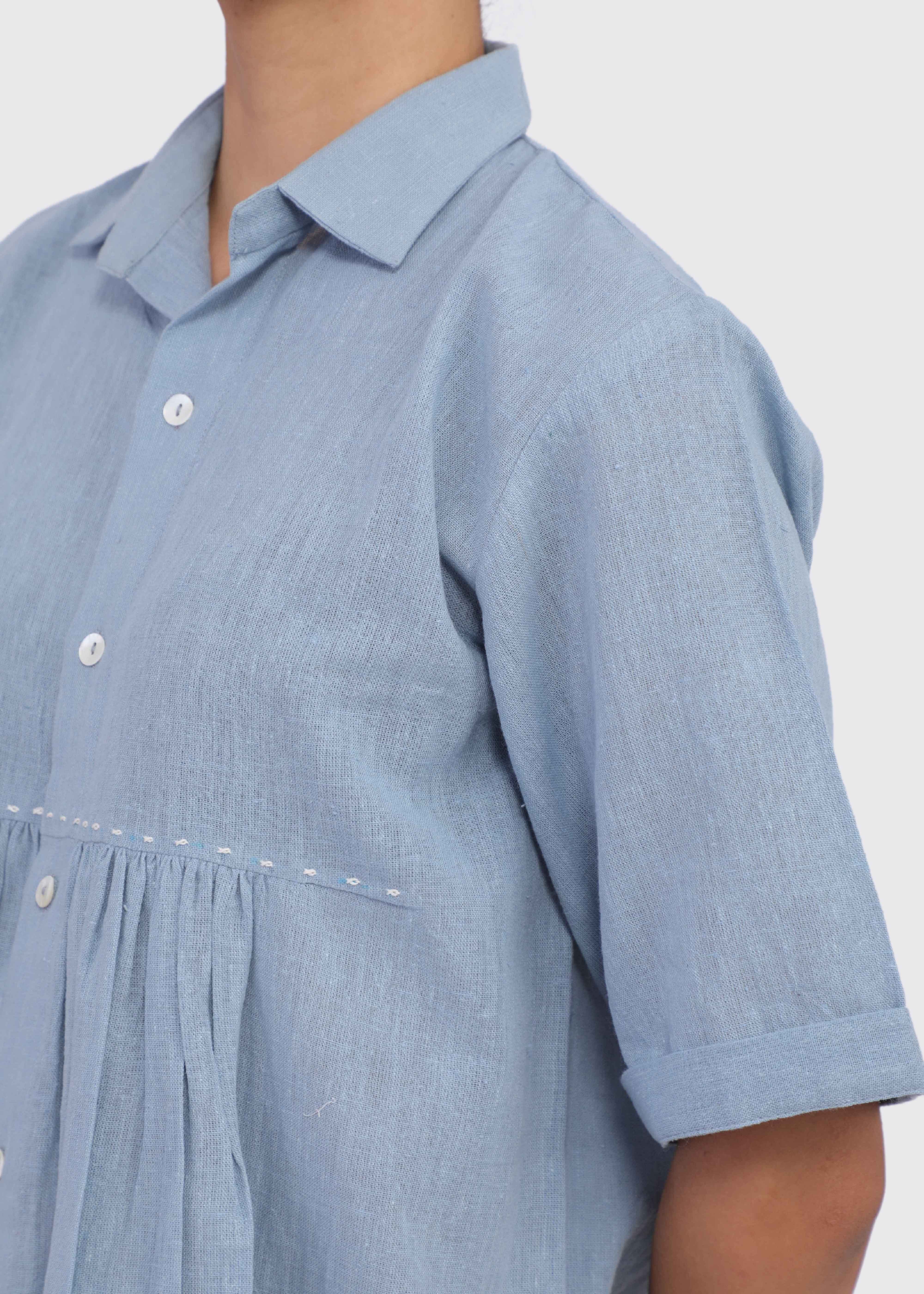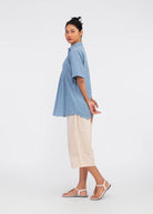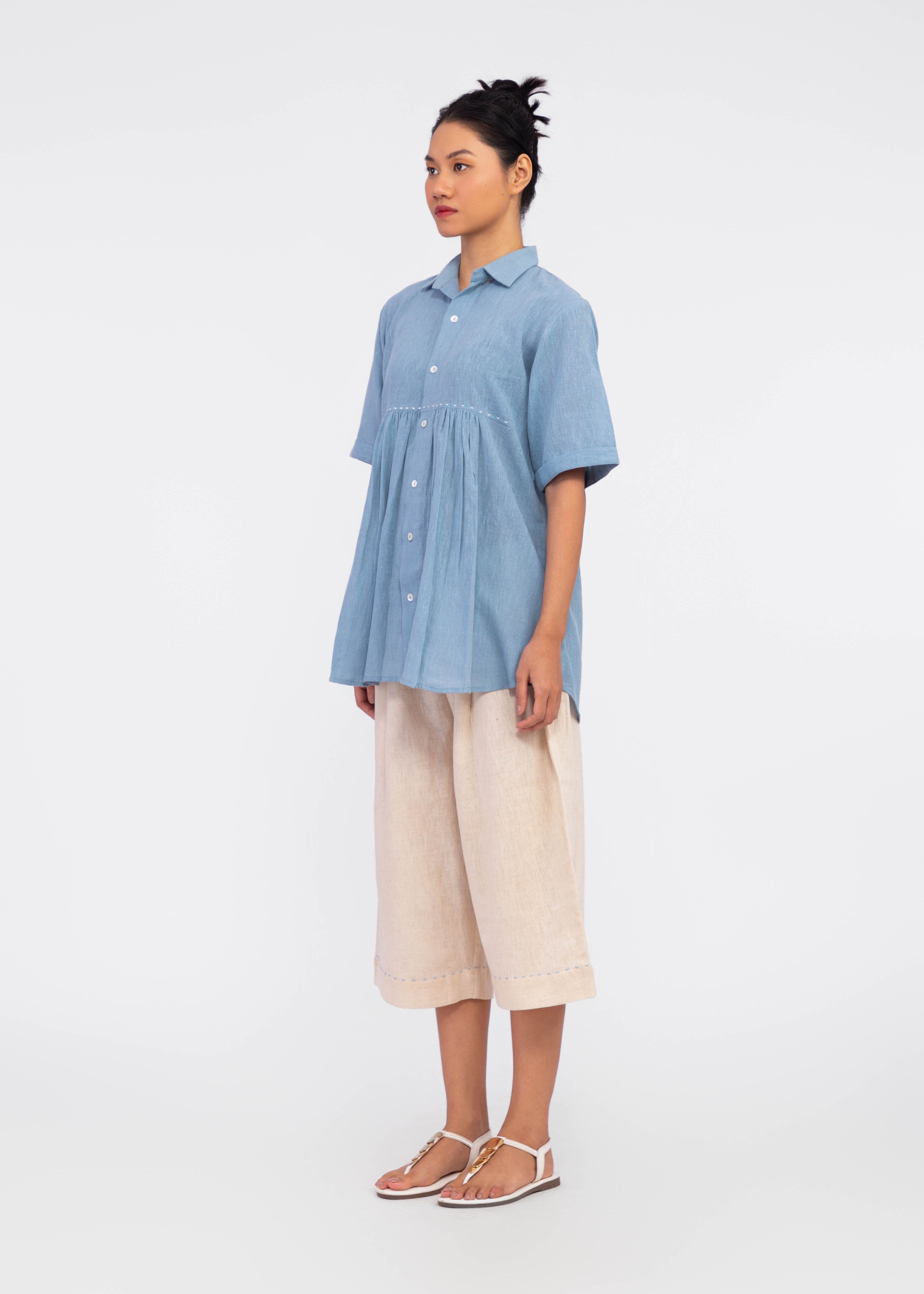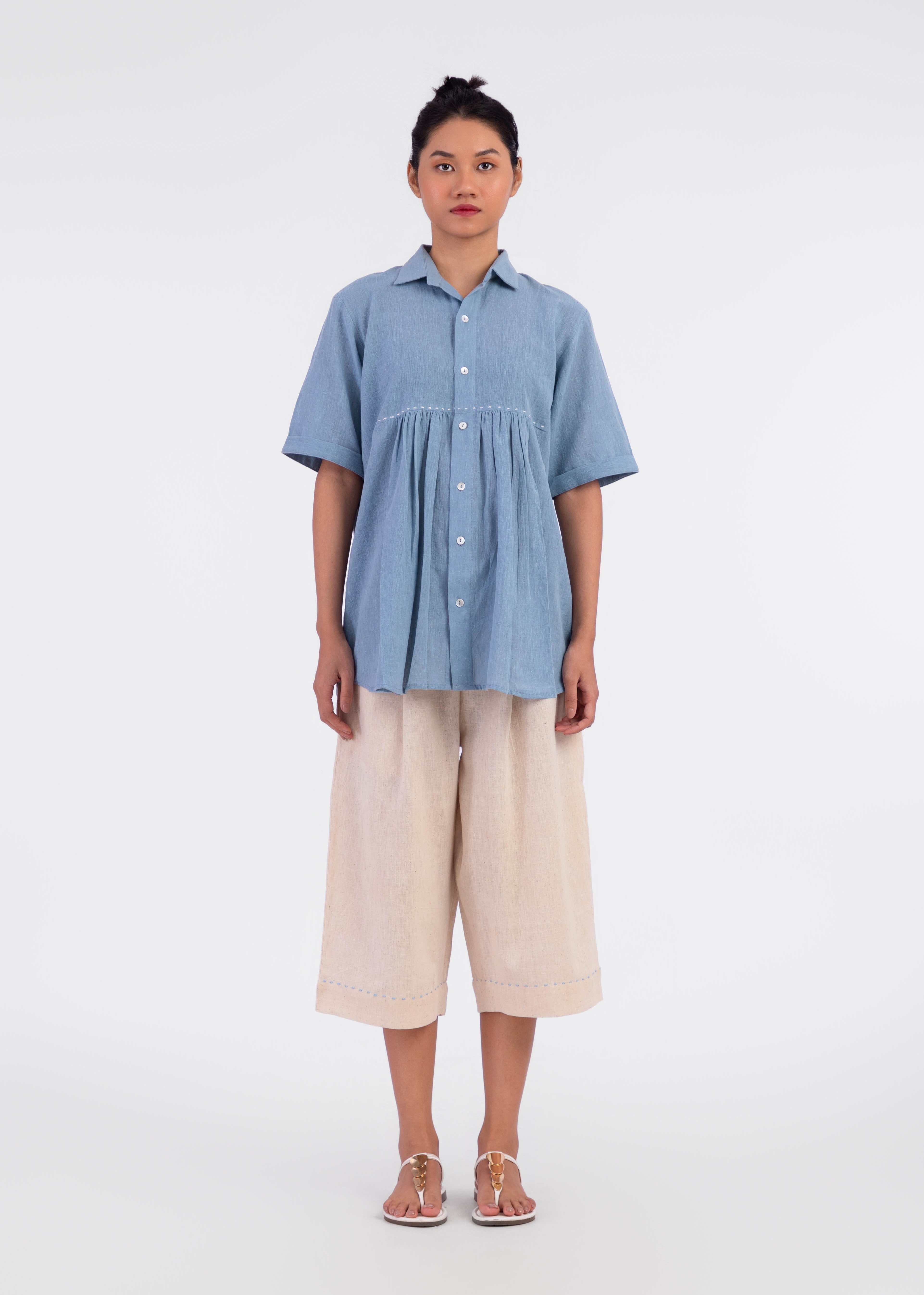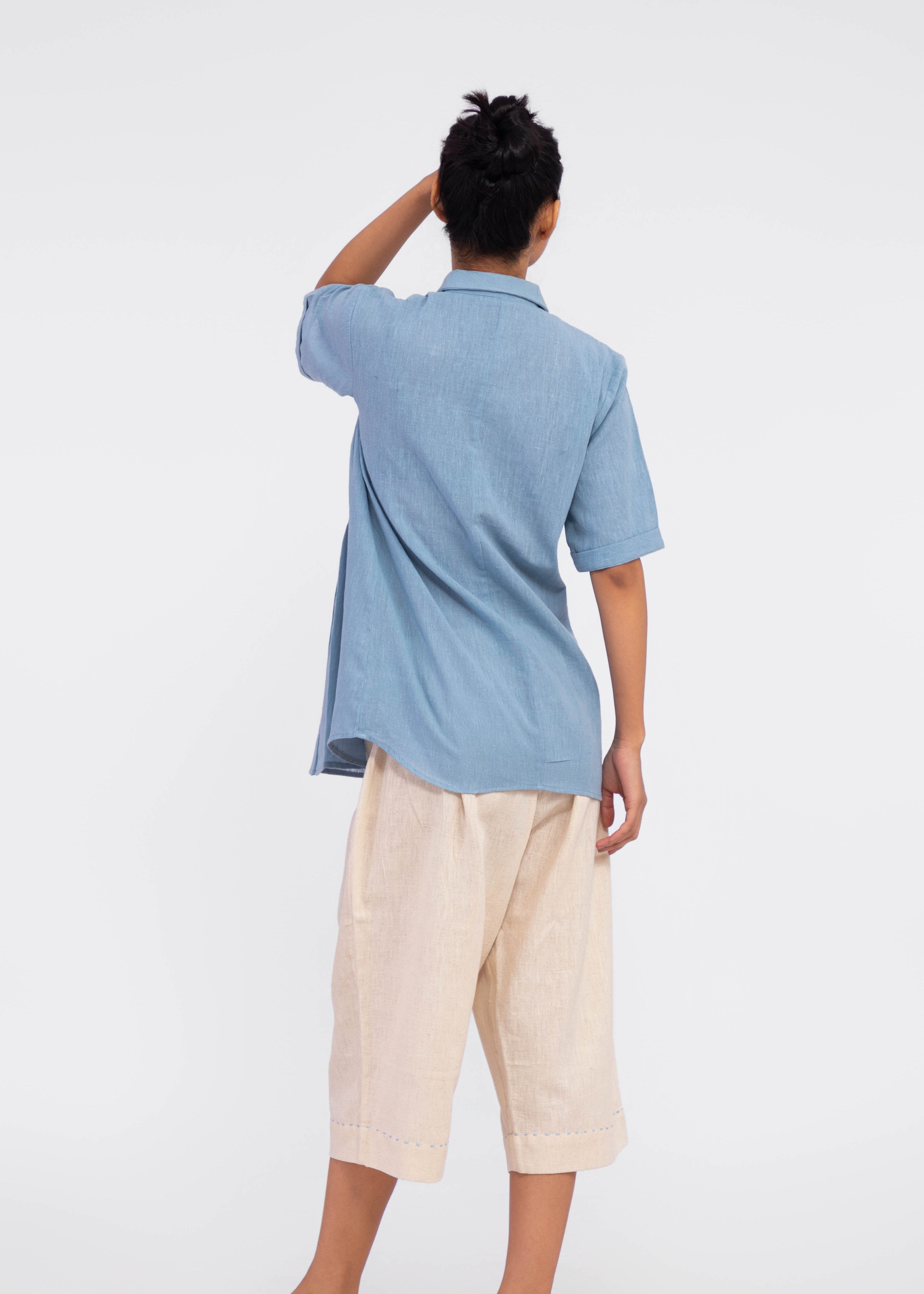 Relaxed and airy, this cord set offers a perfect balance of comfort and style. The set features a blue button-down top with a loose, flared silhouette, designed for ease of movement, paired with wide-legged, natural beige trousers. Both the top and trousers are made from handwoven Kala cotton from the Kutch region of India, known for its sustainable and eco-friendly fabric. Embroidery detailing adds a touch of artisanal craftsmanship, elevating the design.