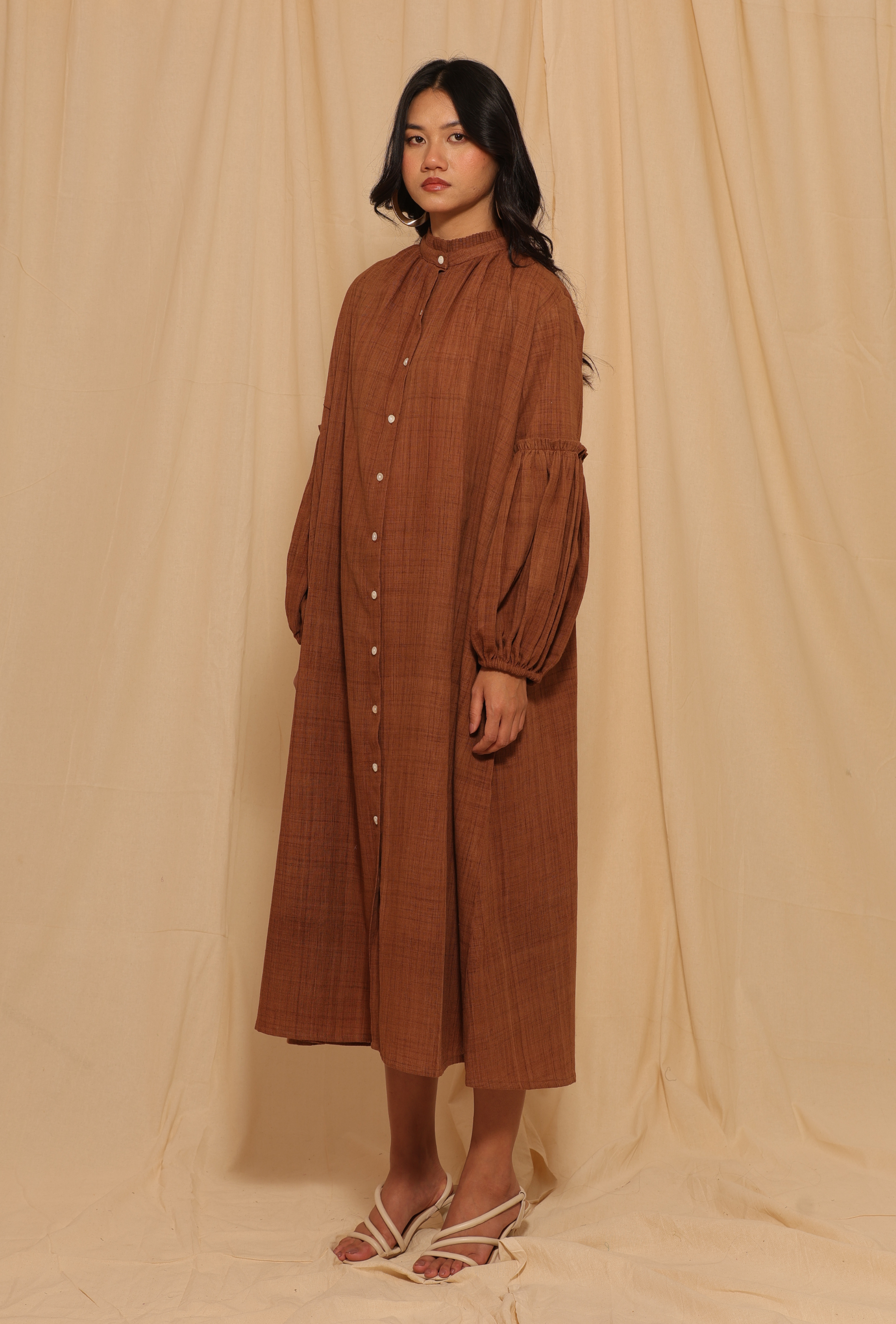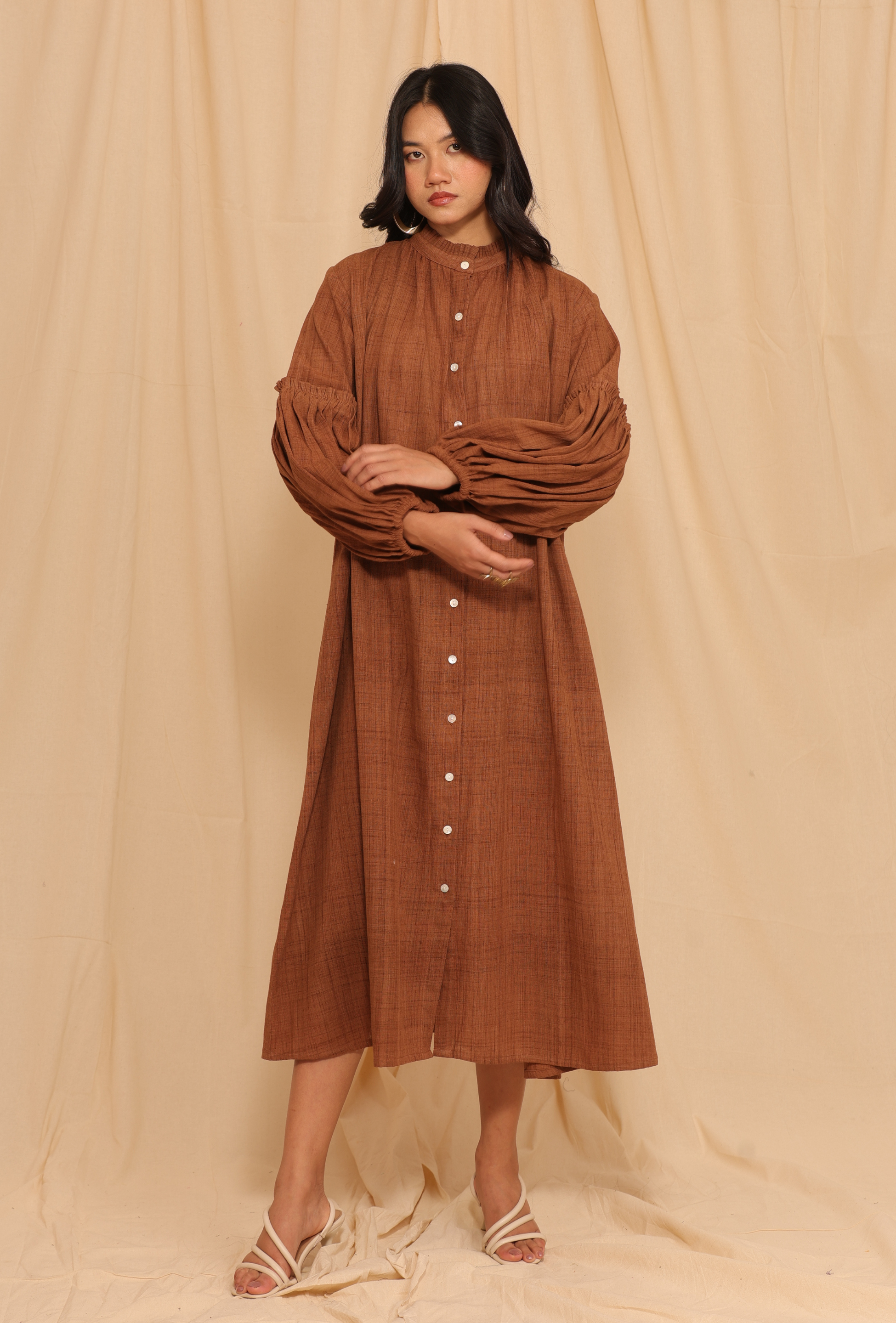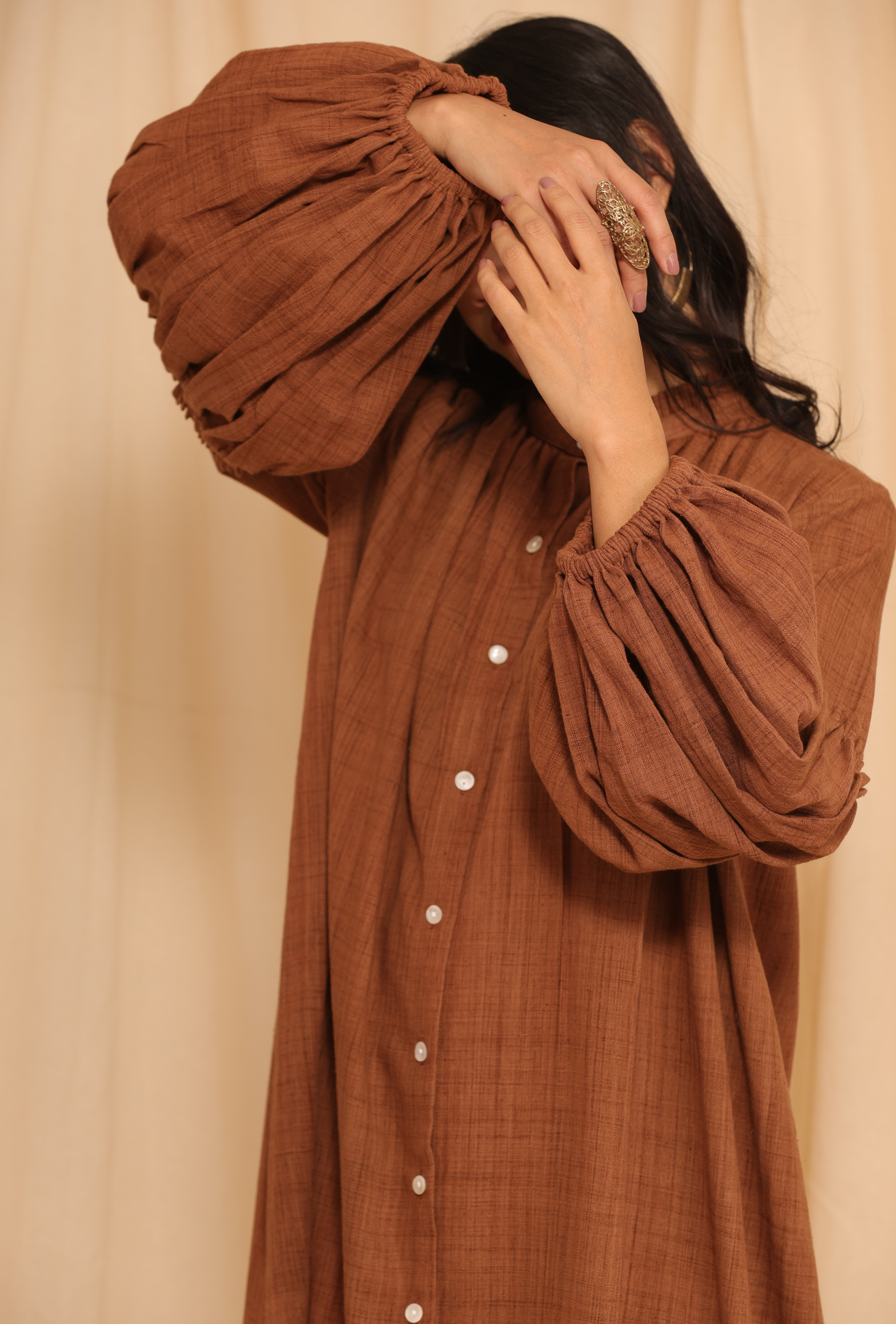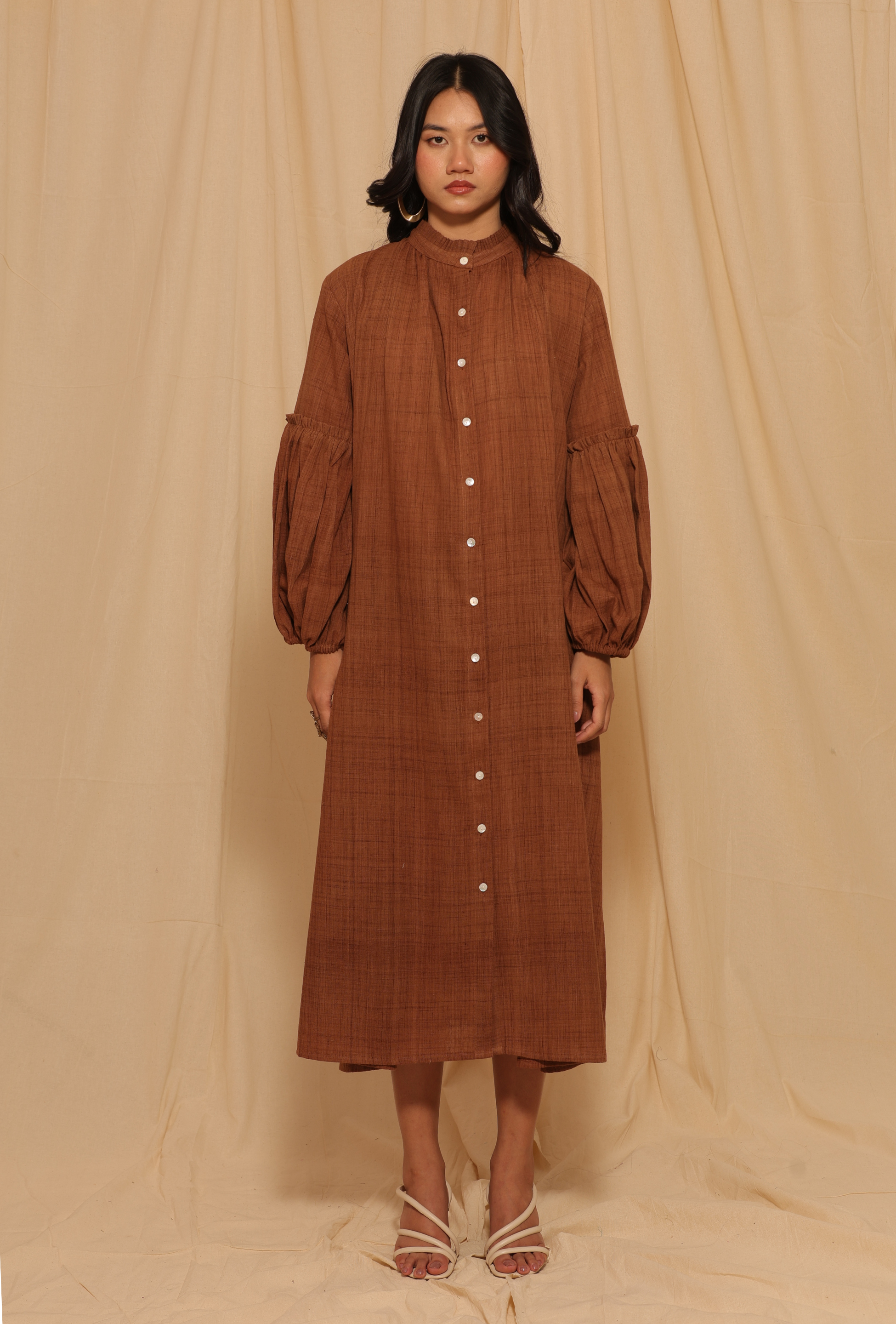 Cocoa Dusk is a serene take on structure and softness. Woven from handspun yarn and handloom cotton, the dress carries a rich cocoa brown hue achieved through natural yarn dyeing that adds depth and warmth to its tone. With a flowing straight silhouette, softly gathered balloon sleeves, and a full front placket, this piece blends tailored simplicity with artisanal texture.