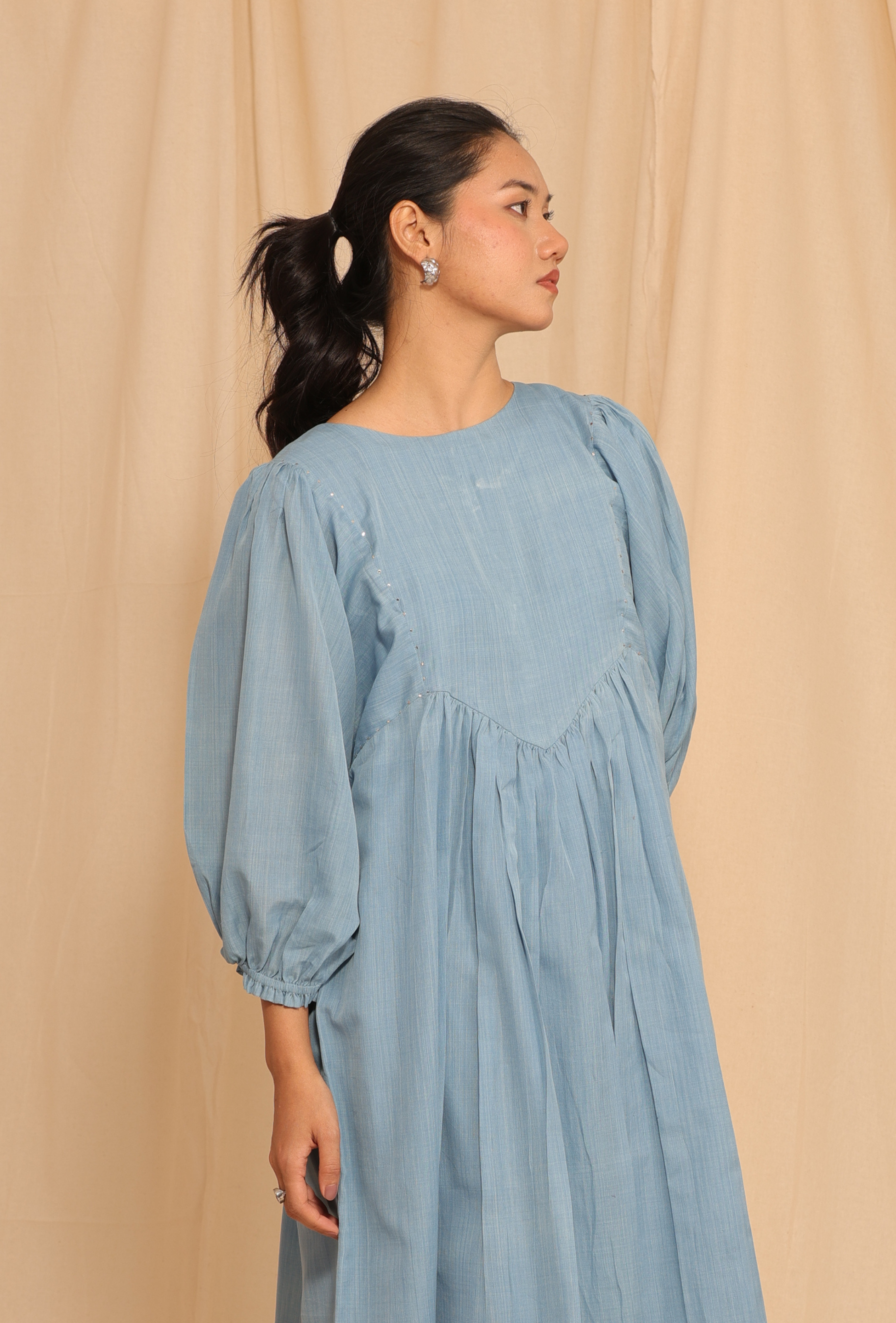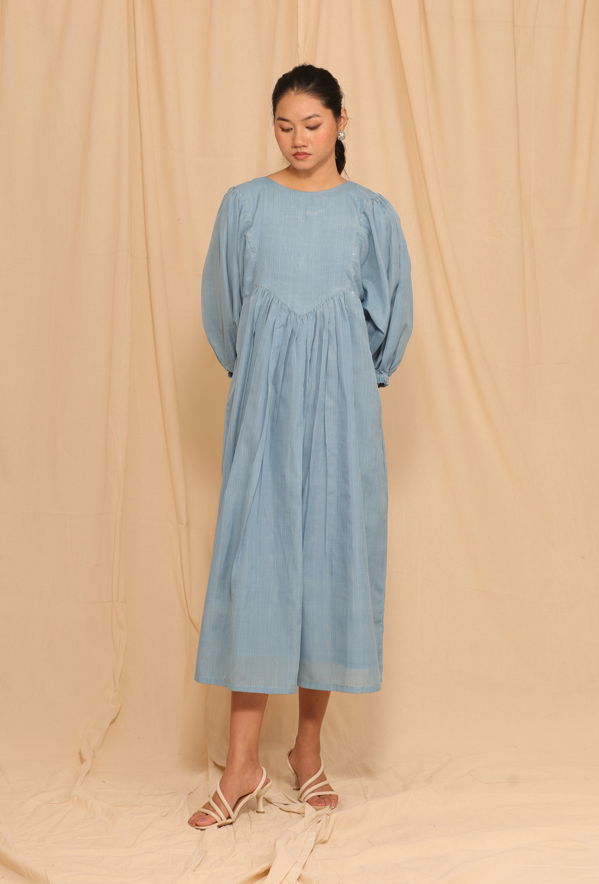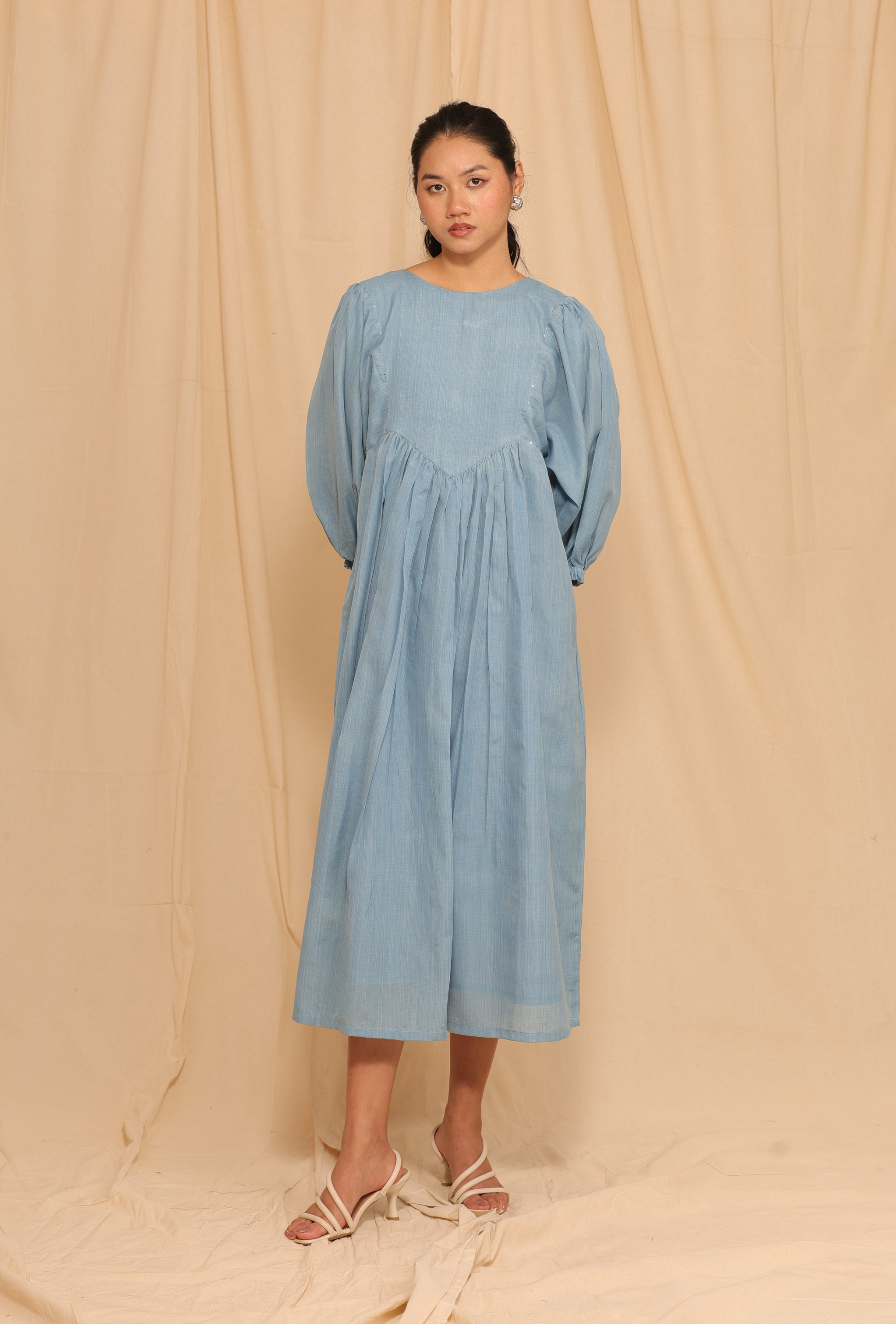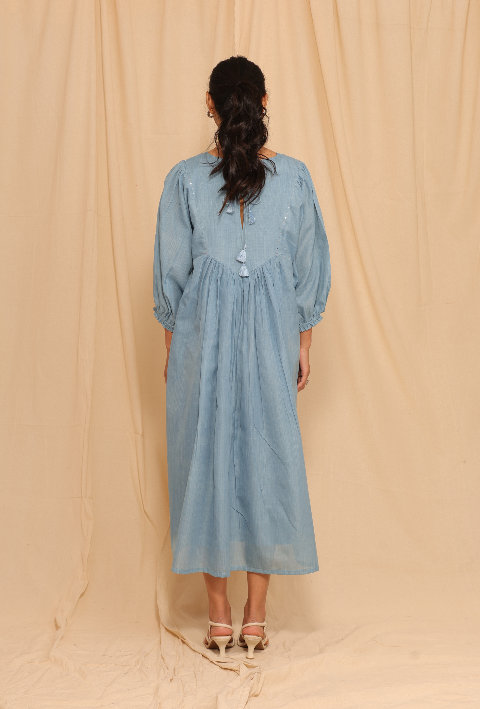 Sky Whisper brings together the elegance of Maheshwari weaving and the subtle shimmer of Mukesh embroidery. Crafted from handwoven Maheshwari fabric and naturally yarn-dyed in indigo, the dress carries a soft sheen and delicate texture. The intricate hand embroidery adds a refined sparkle, making it perfect for both quiet celebrations and elevated everyday wear.