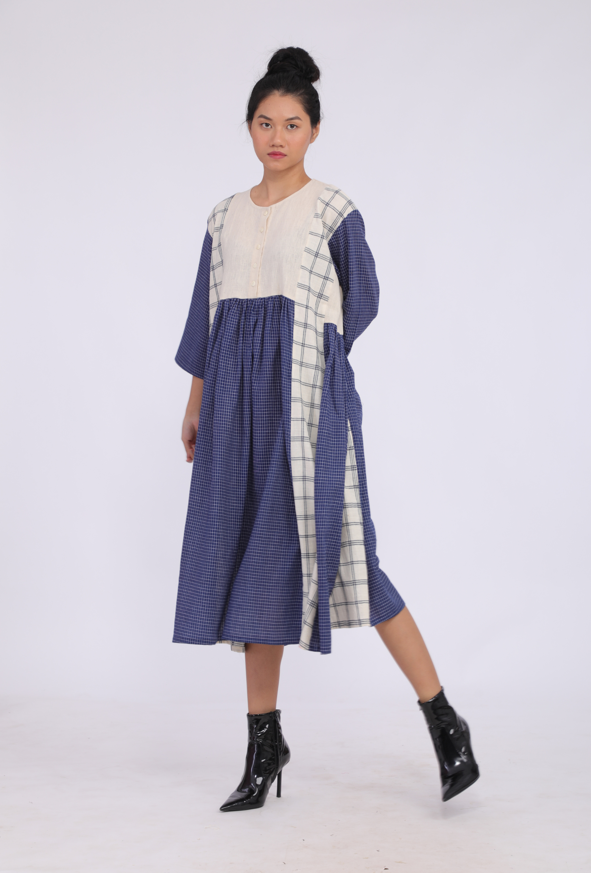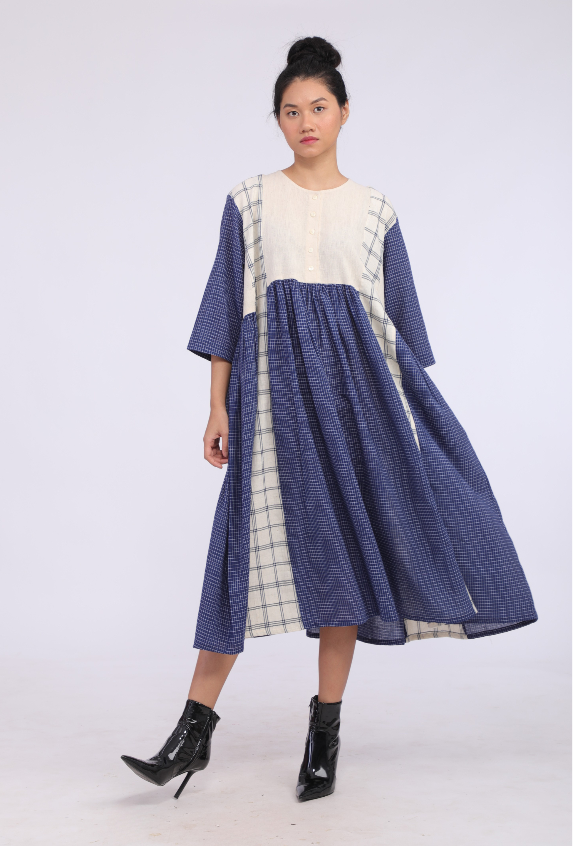 Crafted from 100% handwoven Khadi, this dress features an indigo yarn-dyed handloom fabric. The design showcases a bold, long yoke with a beautiful contrast of checked patterns, adding depth to the look. The big gathered waist creates a flowing, relaxed silhouette, making it both stylish and comfortable for all-day wear.