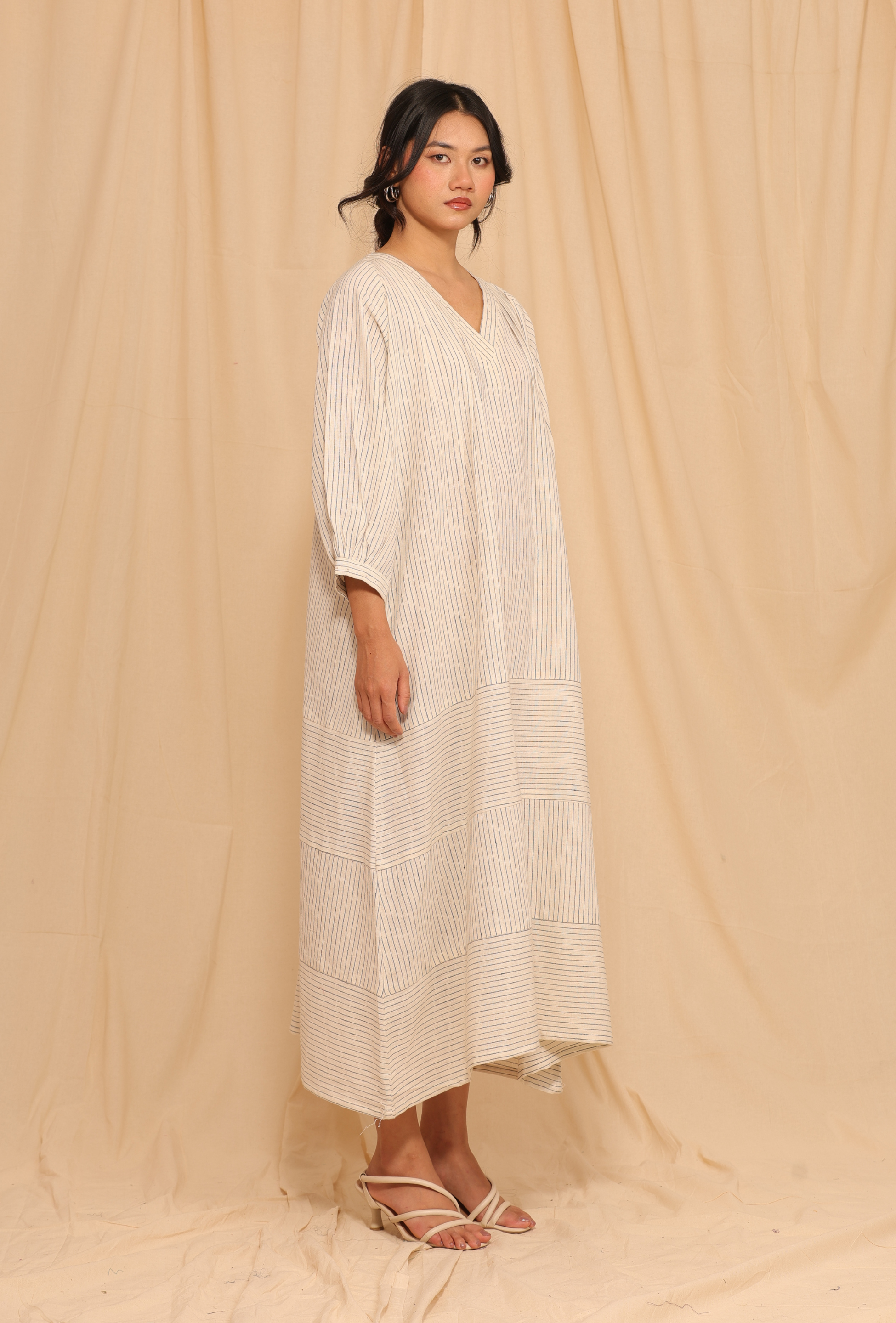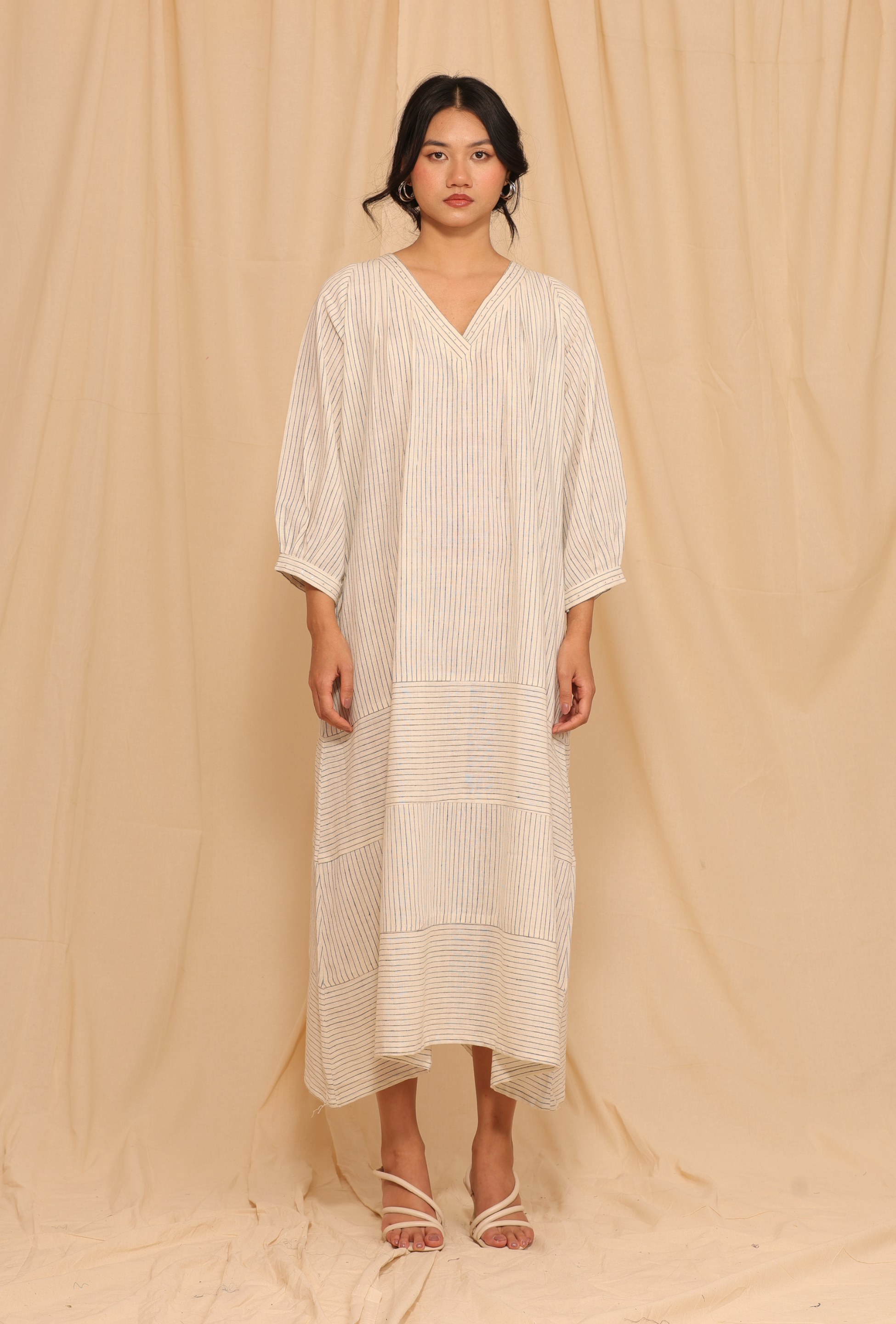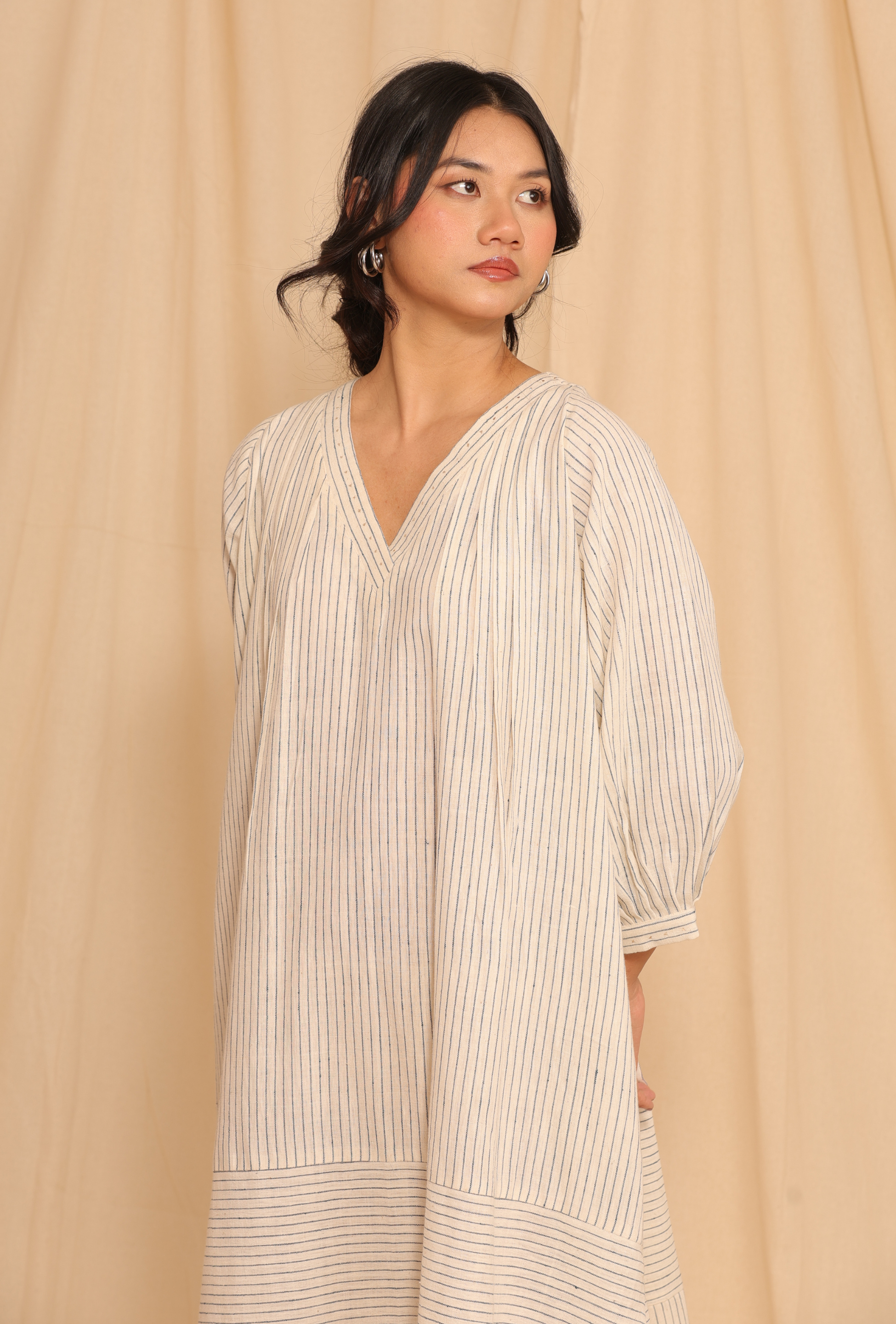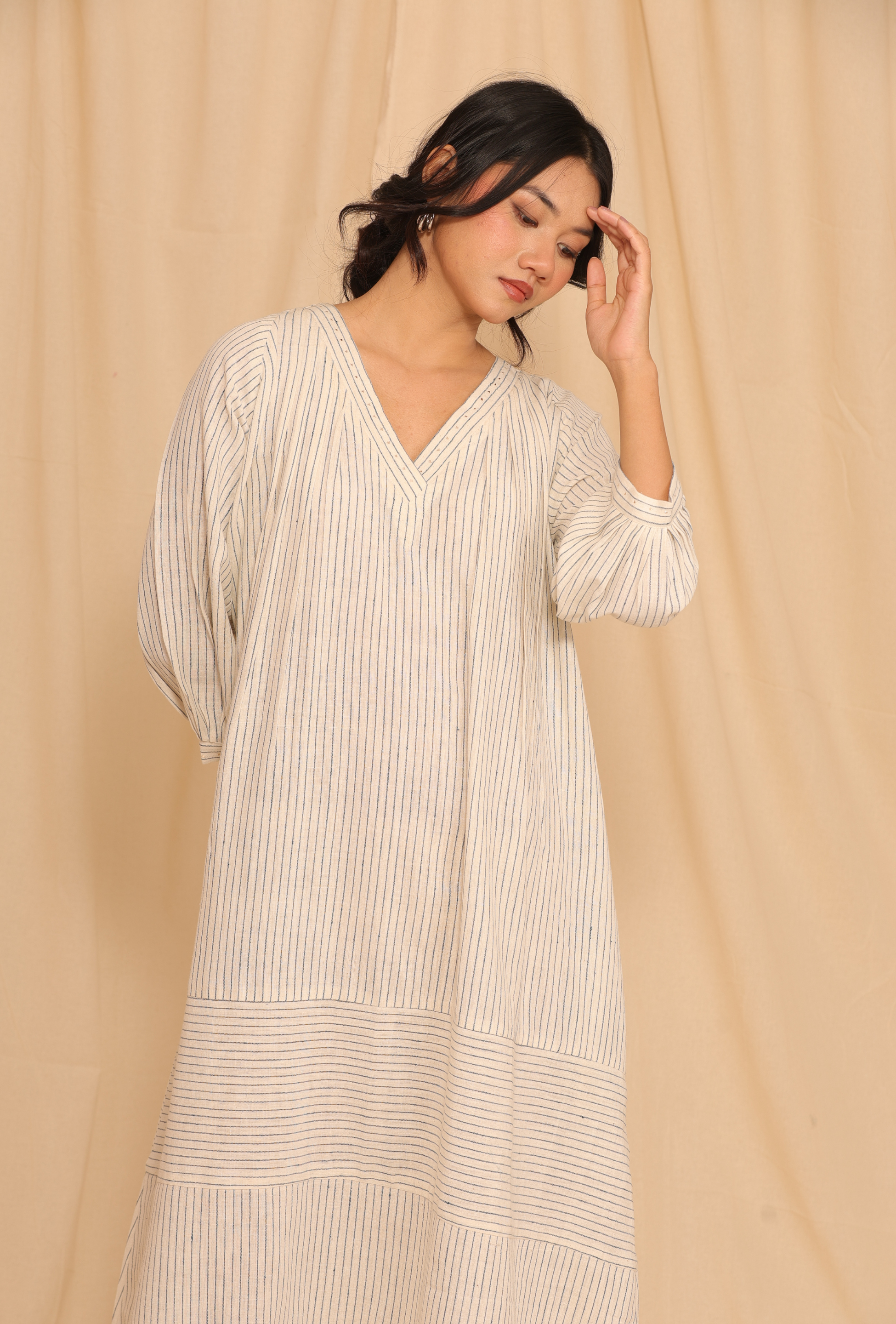 Soft Stripe dress offers a refined structure with artisanal charm. The neckline is delicately embellished with Mukesh embroidery, adding a gentle shimmer to its clean silhouette. With its minimal detailing and thoughtful construction, this dress balances everyday ease with timeless elegance.