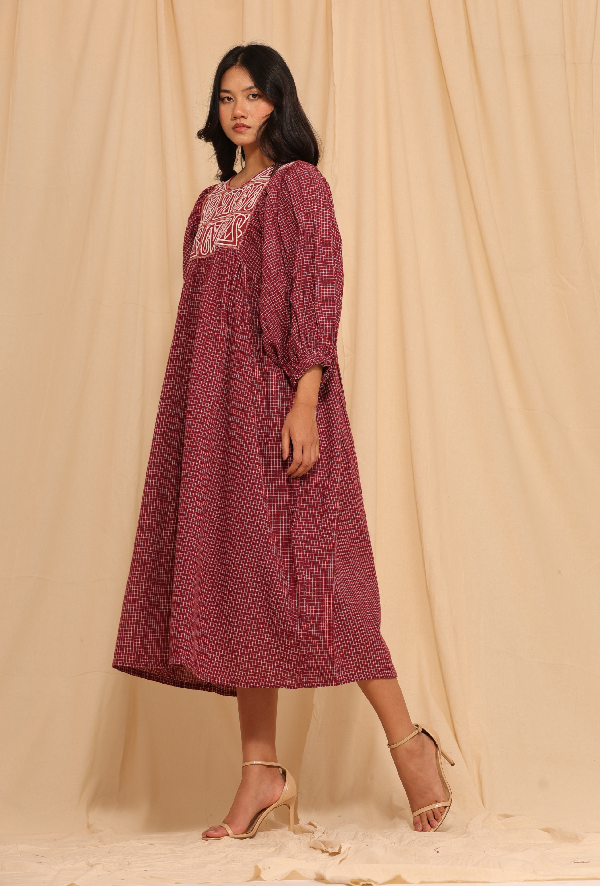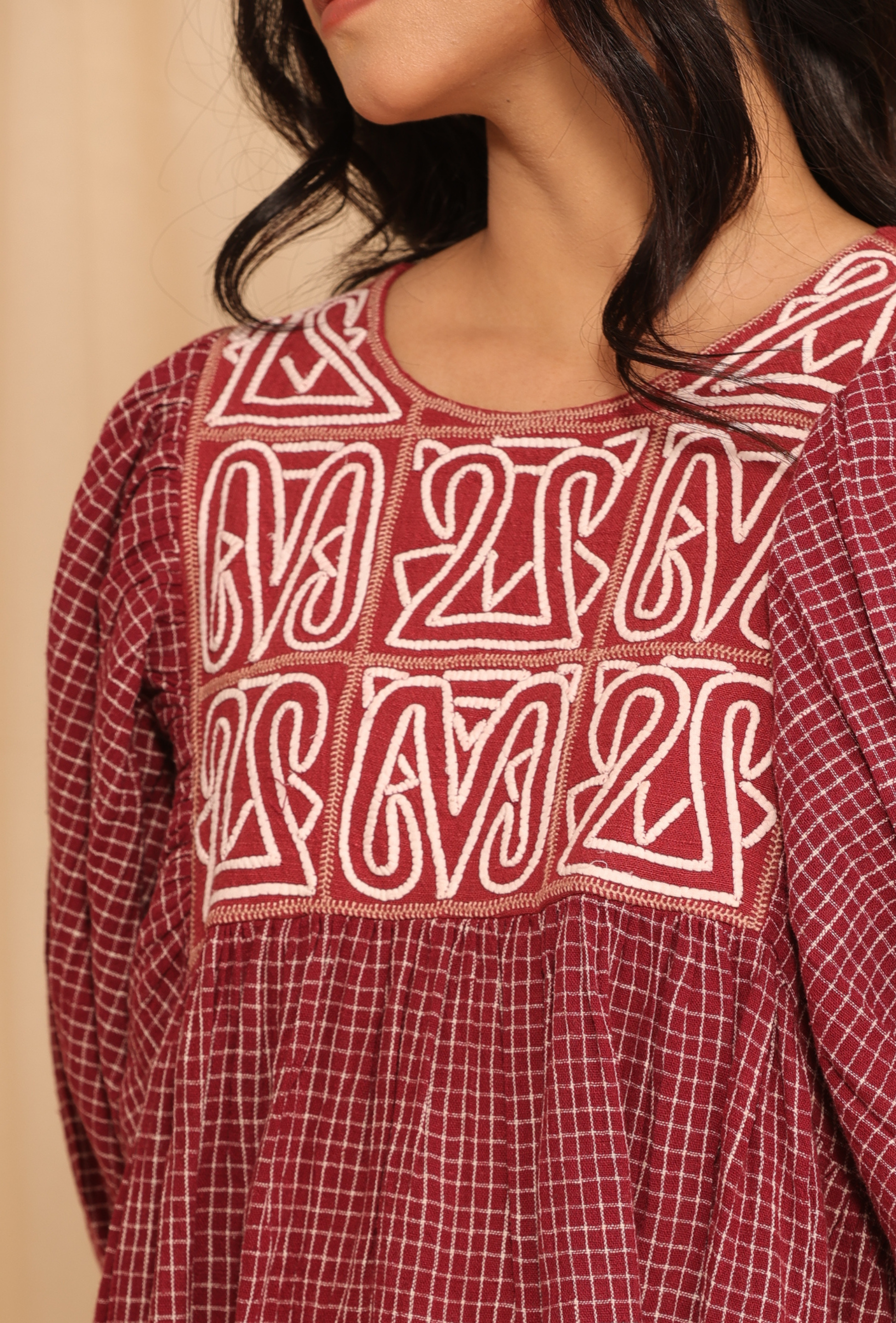MAROON MAZE – Checkered Dress with Katab Embroidery