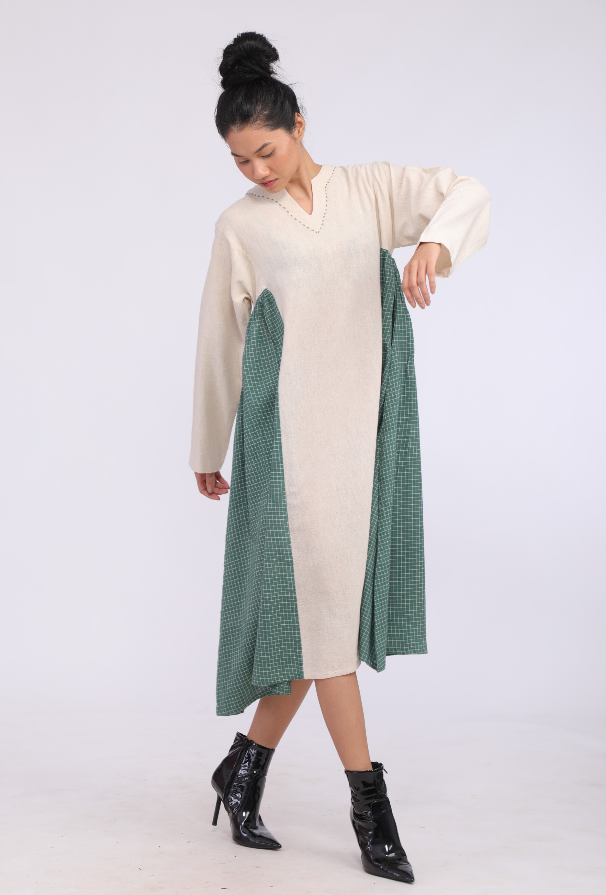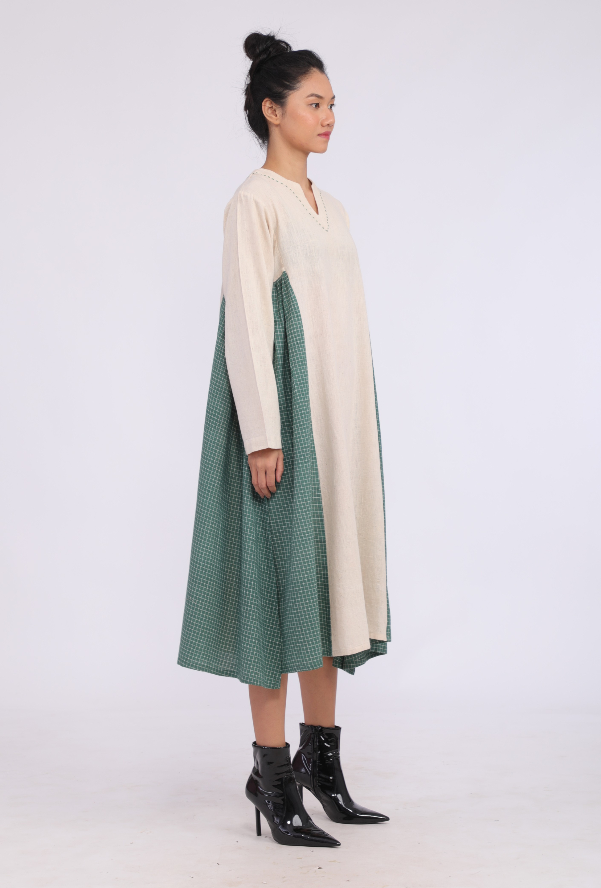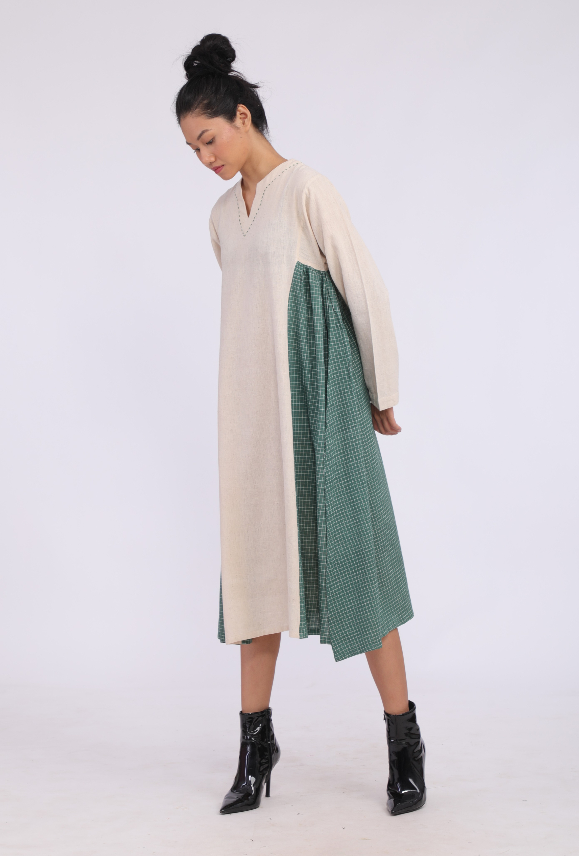 Relaxed fit dress crafted from indigenous organic cotton sourced from Bhuj. Features intricate hand embroidery along the neckline and side panels made from khadi yarn-dyed cotton in a deep green for a striking contrast.