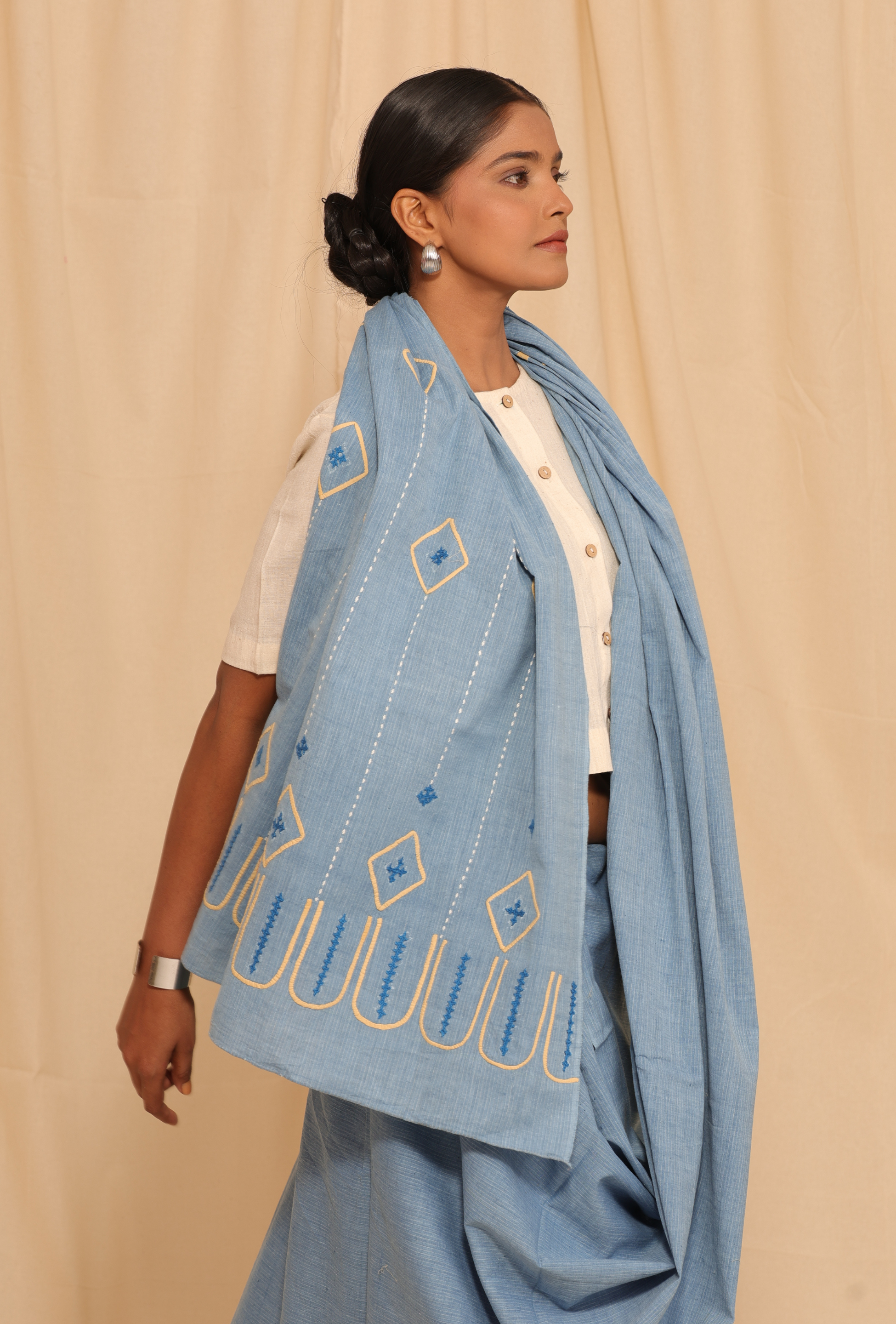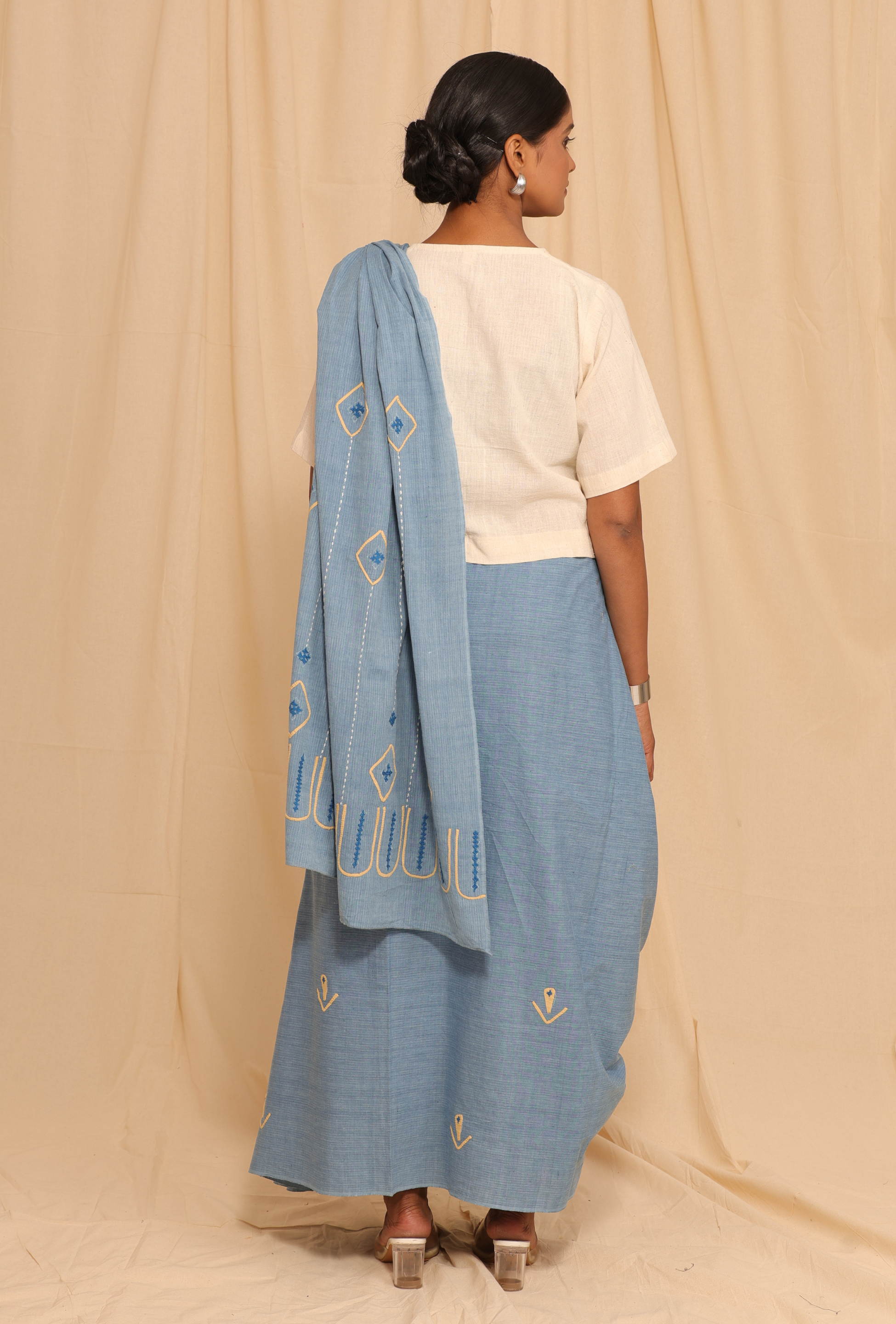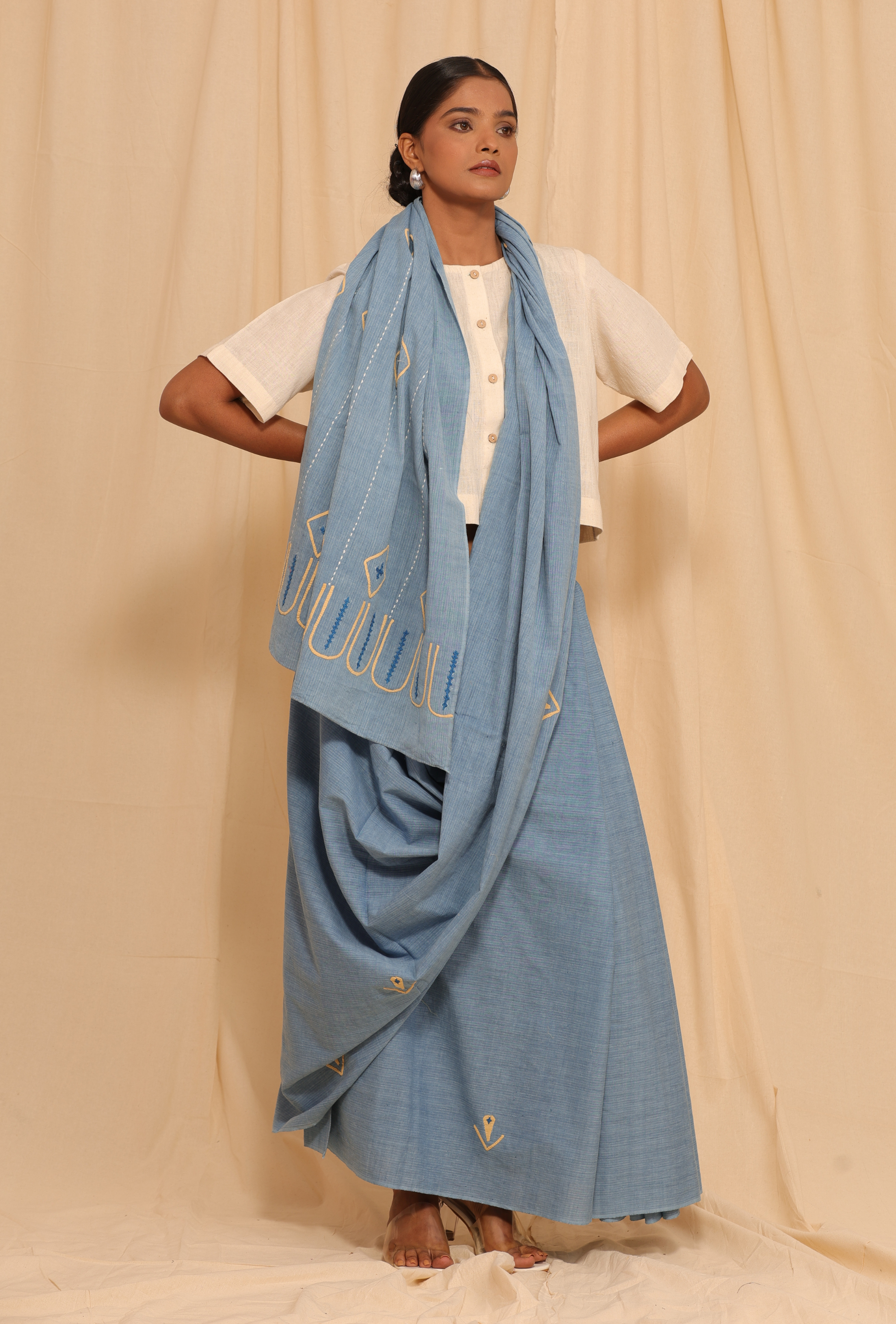 A saree that blends tradition with simplicity. Handspun khadi cotton, dyed in indigo, forms the base, embellished with delicate embroidery by community artisans from Kutch. Modern, minimal, yet deeply rooted.