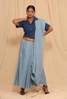 The Ocean Trail saree is a serene blue Maheshwari handloom cotton masterpiece, distinguished by its long, continuous Trajko embroidery that flows gracefully across the fabric like ocean waves. Crafted entirely from Maheshwari handloom cotton. The Trajko stitch, known for its precise, flowing needlework, adds dynamic texture and artisanal depth, evoking a sense of endless movement and heritage craftsmanship.