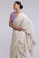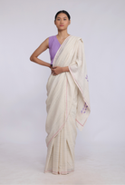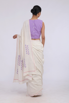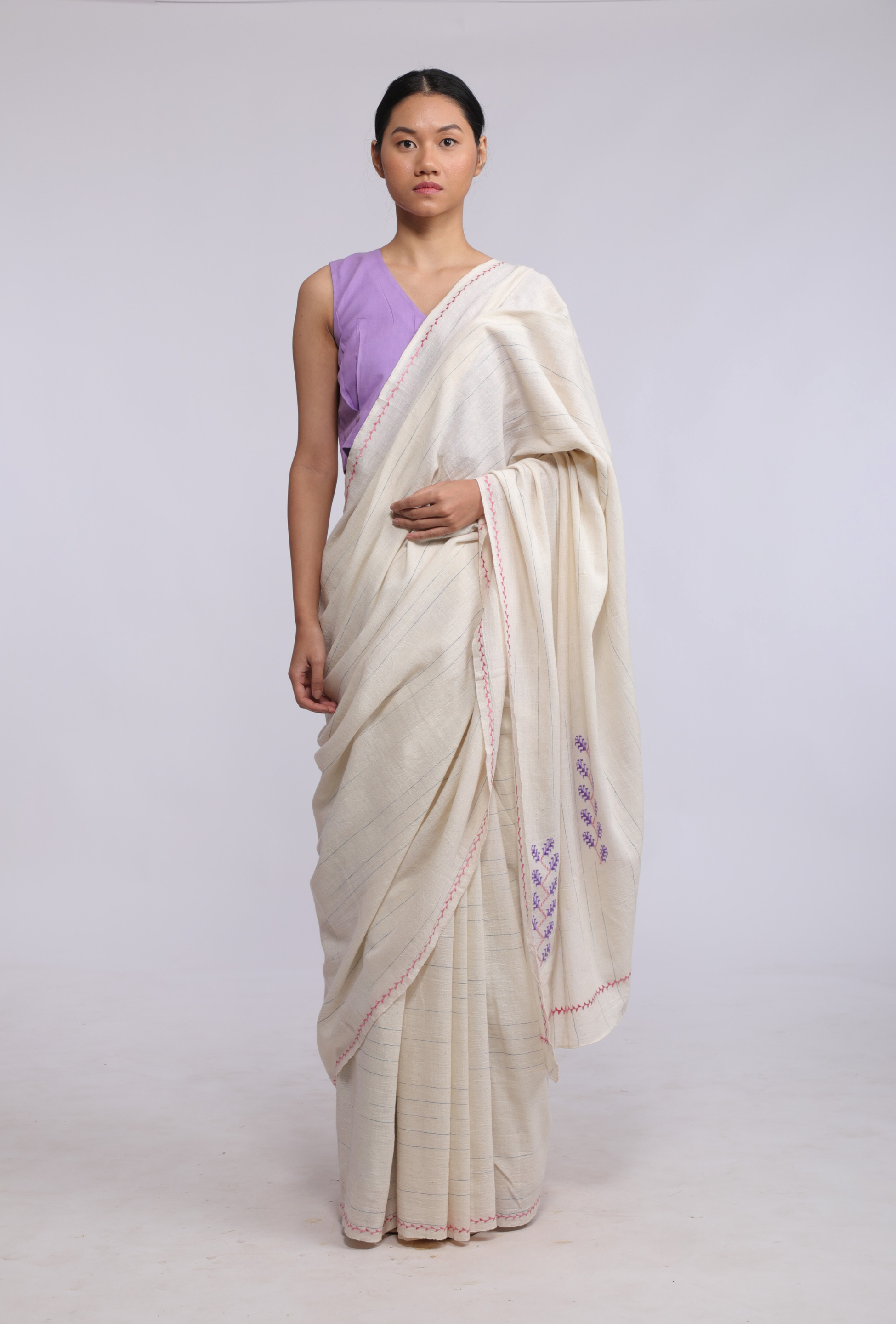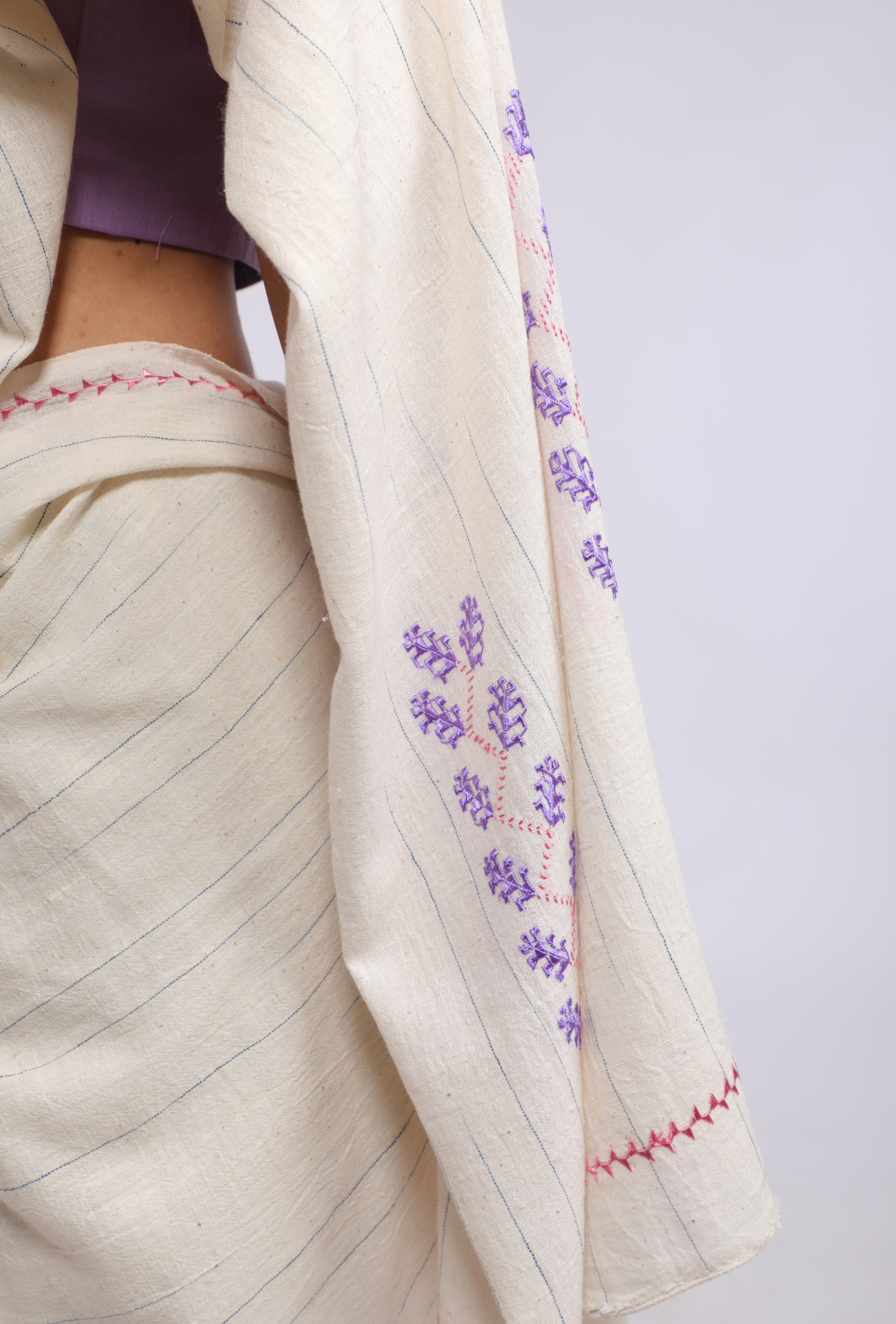 Graceful saree crafted from handwoven fabric, offering a timeless and elegant look. The pallu is adorned with intricate Suf embroidery, a traditional craft that adds delicate artistry to the design. This hand-embroidered masterpiece has been brought to life by skilled women artisans from the Kutch region.