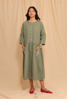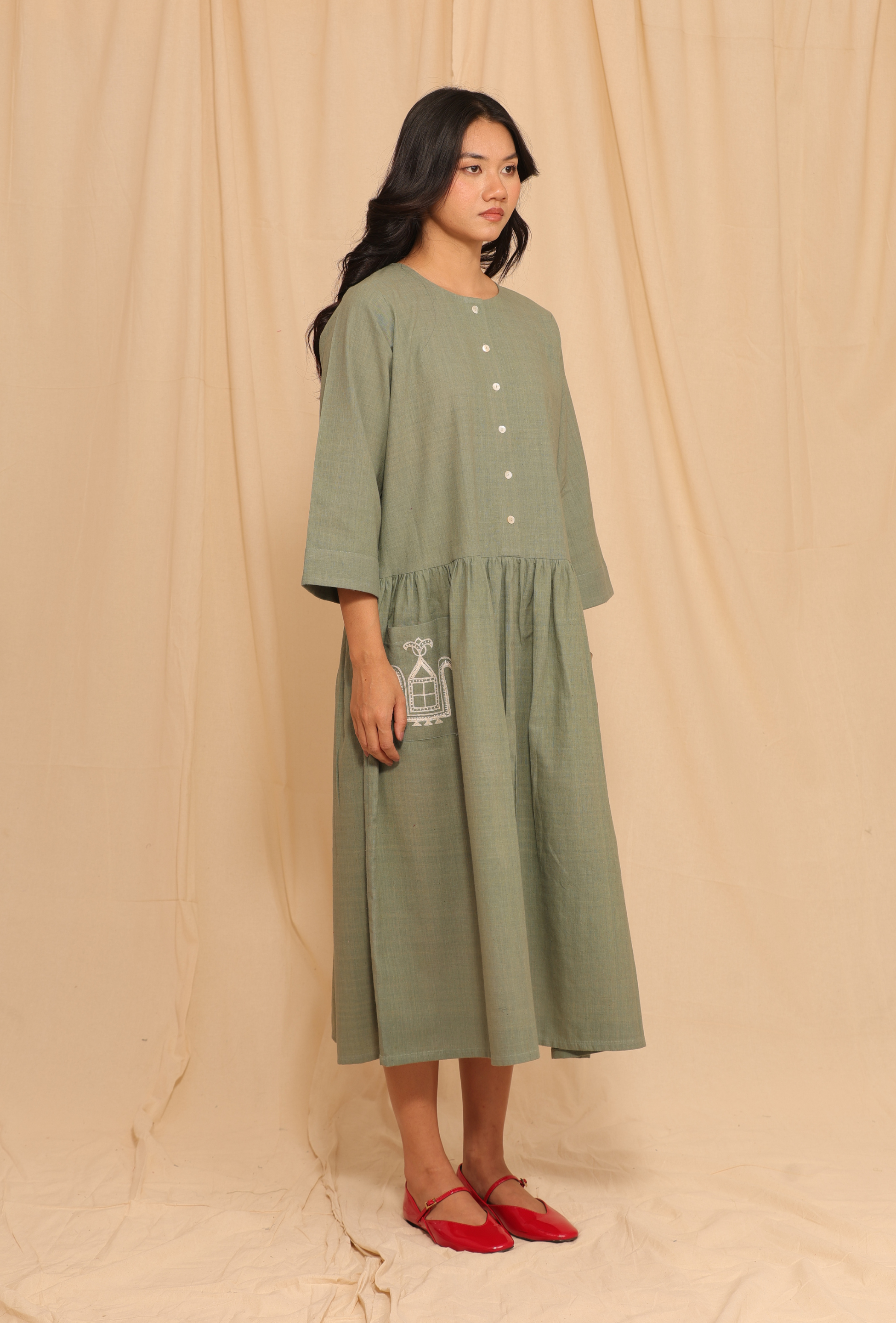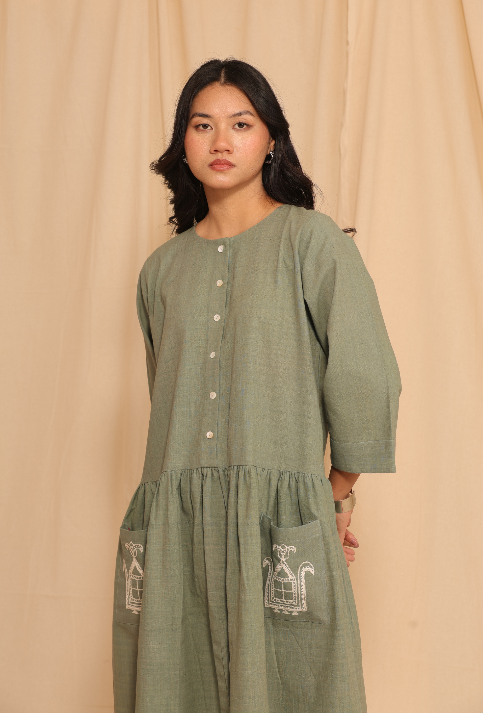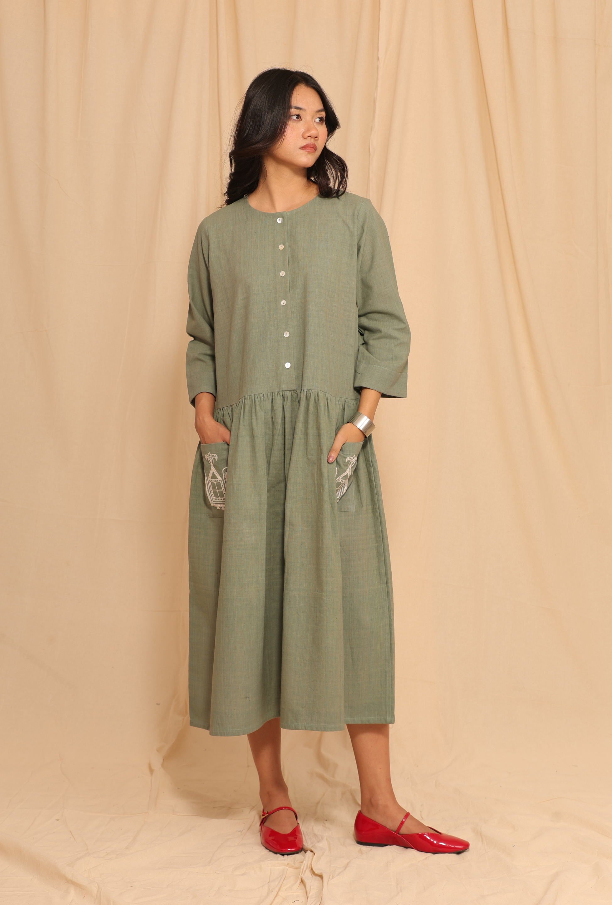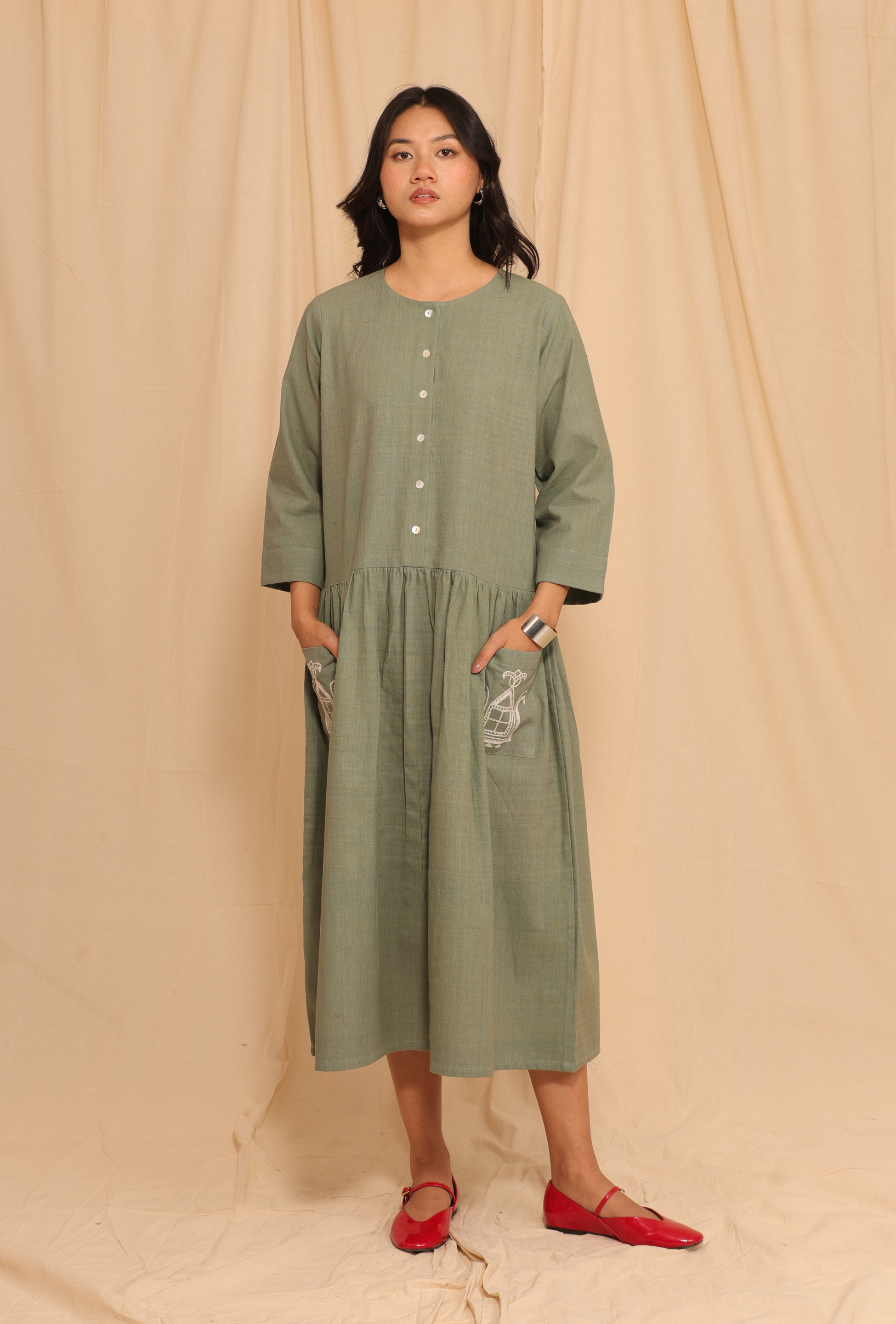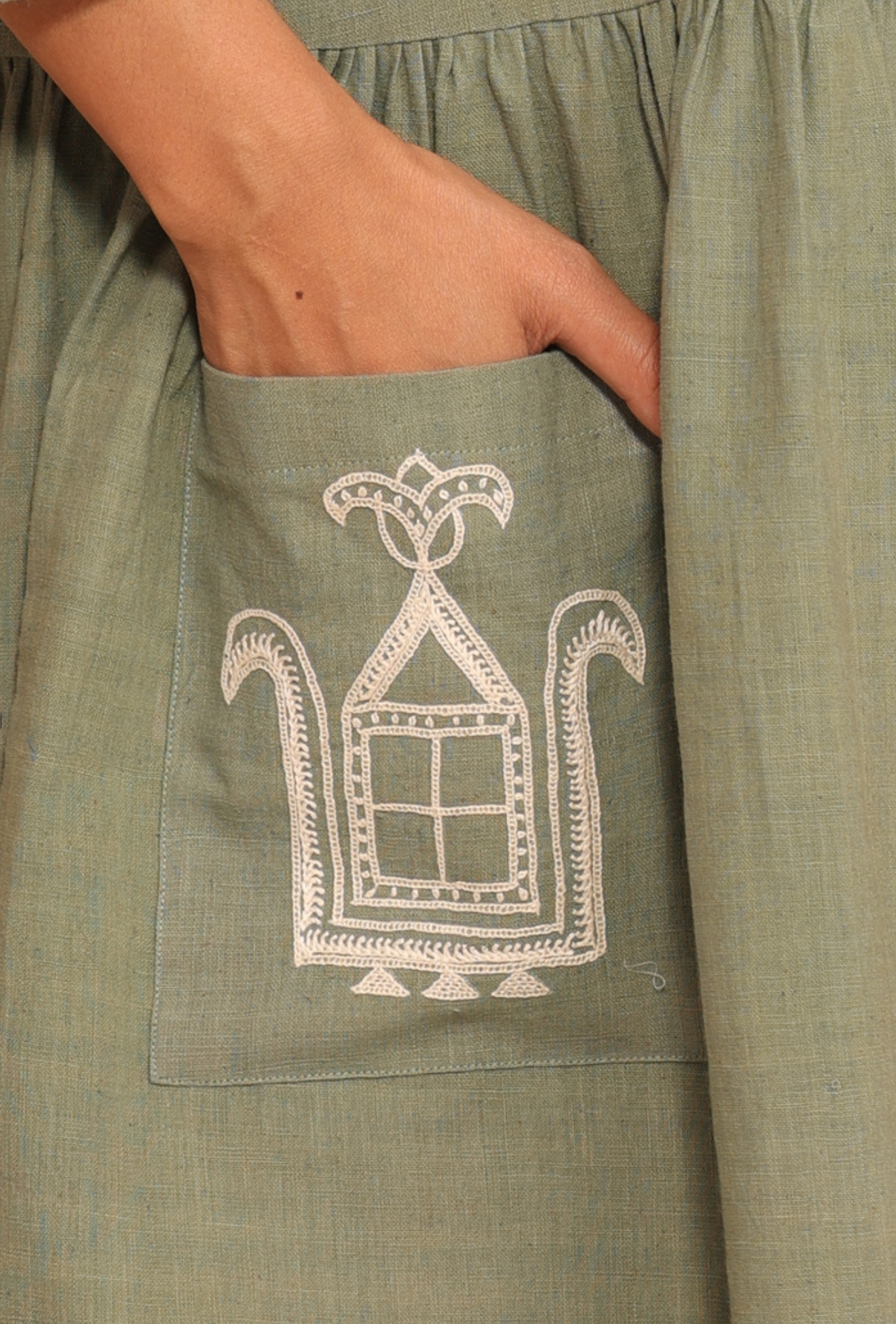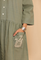 Rooted in tradition and stitched with purpose, Pocket Tales celebrates the intricate hand embroidery of the Ahir community. Crafted from soft, handwoven cotton, this dress is defined by its vibrant detailing and uniquely embroidered pockets — each one telling a story of craft and culture. With its relaxed fit and artistic charm, it’s a versatile piece for mindful, modern wardrobes.
