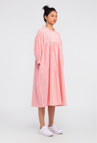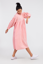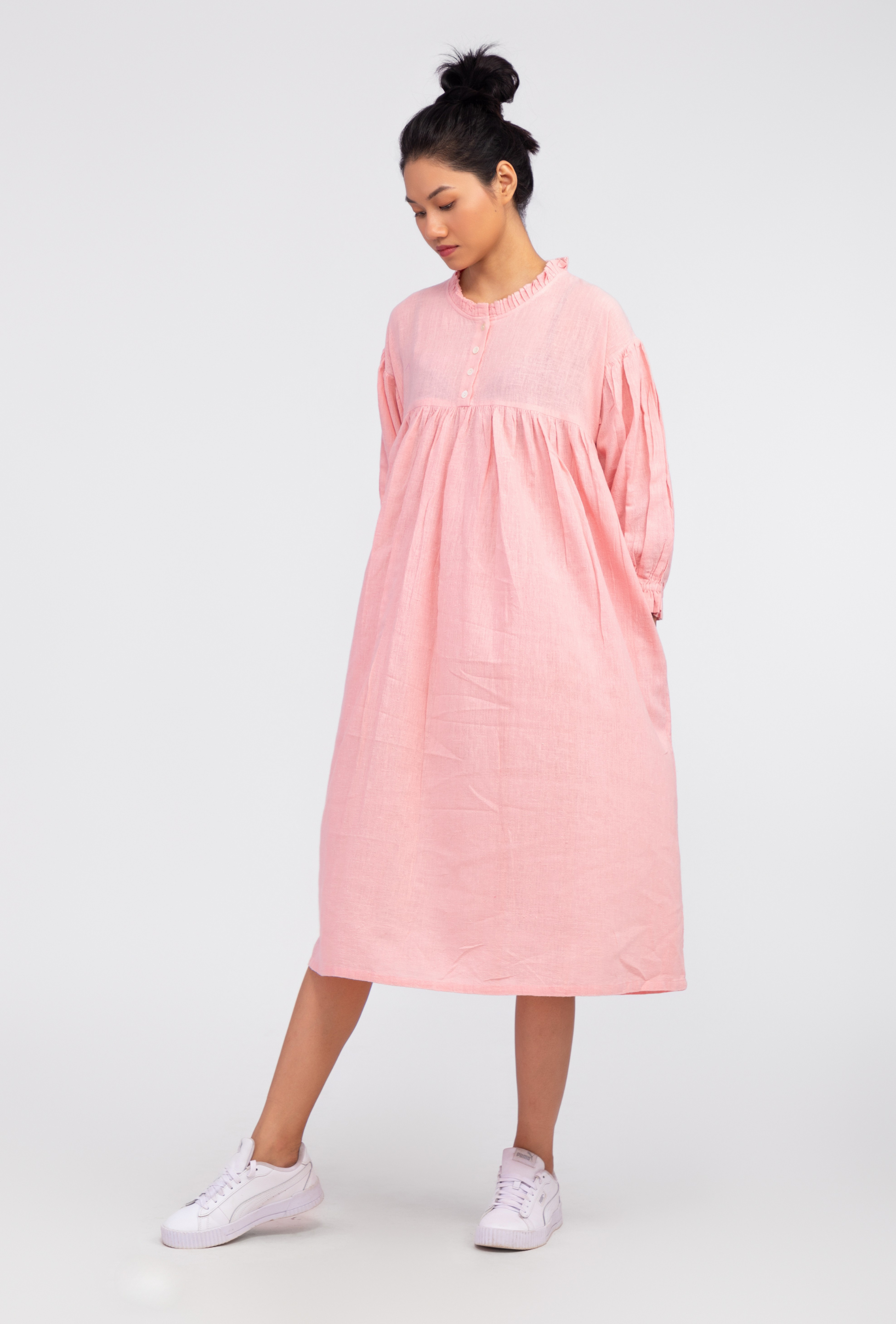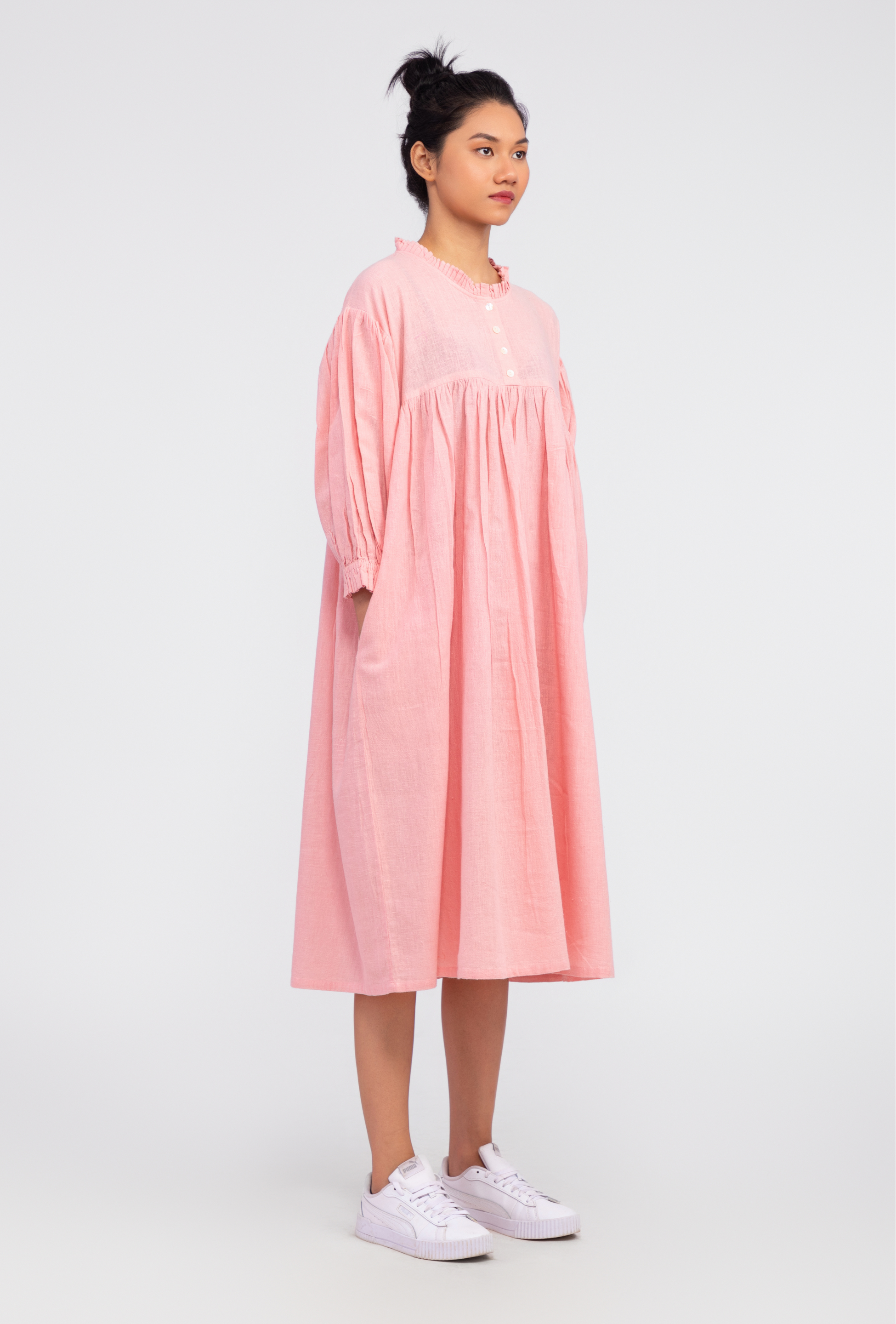 Crafted from peach yarn-dyed handwoven fabric from the Kutch region of India, this dress offers a minimalist design with a focus on comfort. The relaxed, gathered silhouette ensures ease of movement, while the soft peach tone adds a touch of understated elegance. The ruffled collar and voluminous sleeves enhance the dress's airy feel, making it perfect for everyday wear.