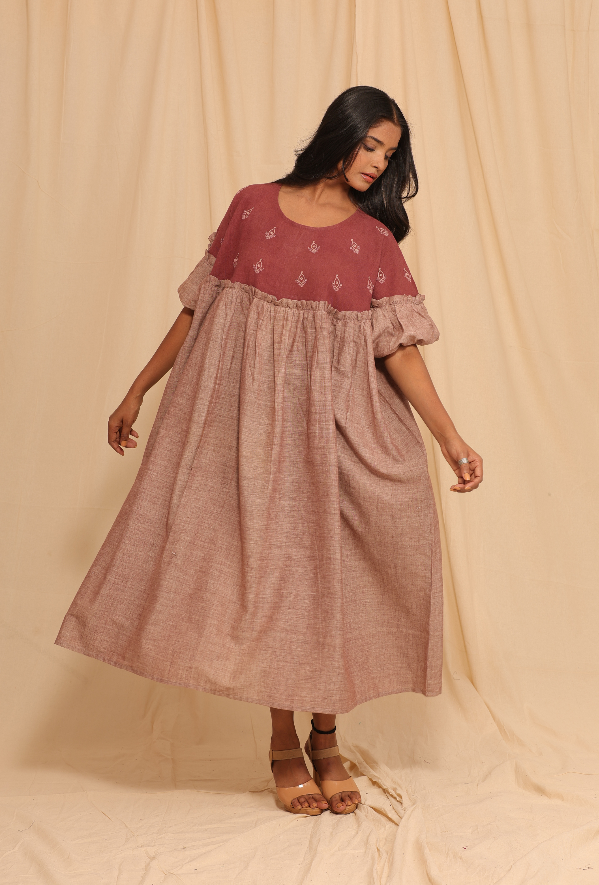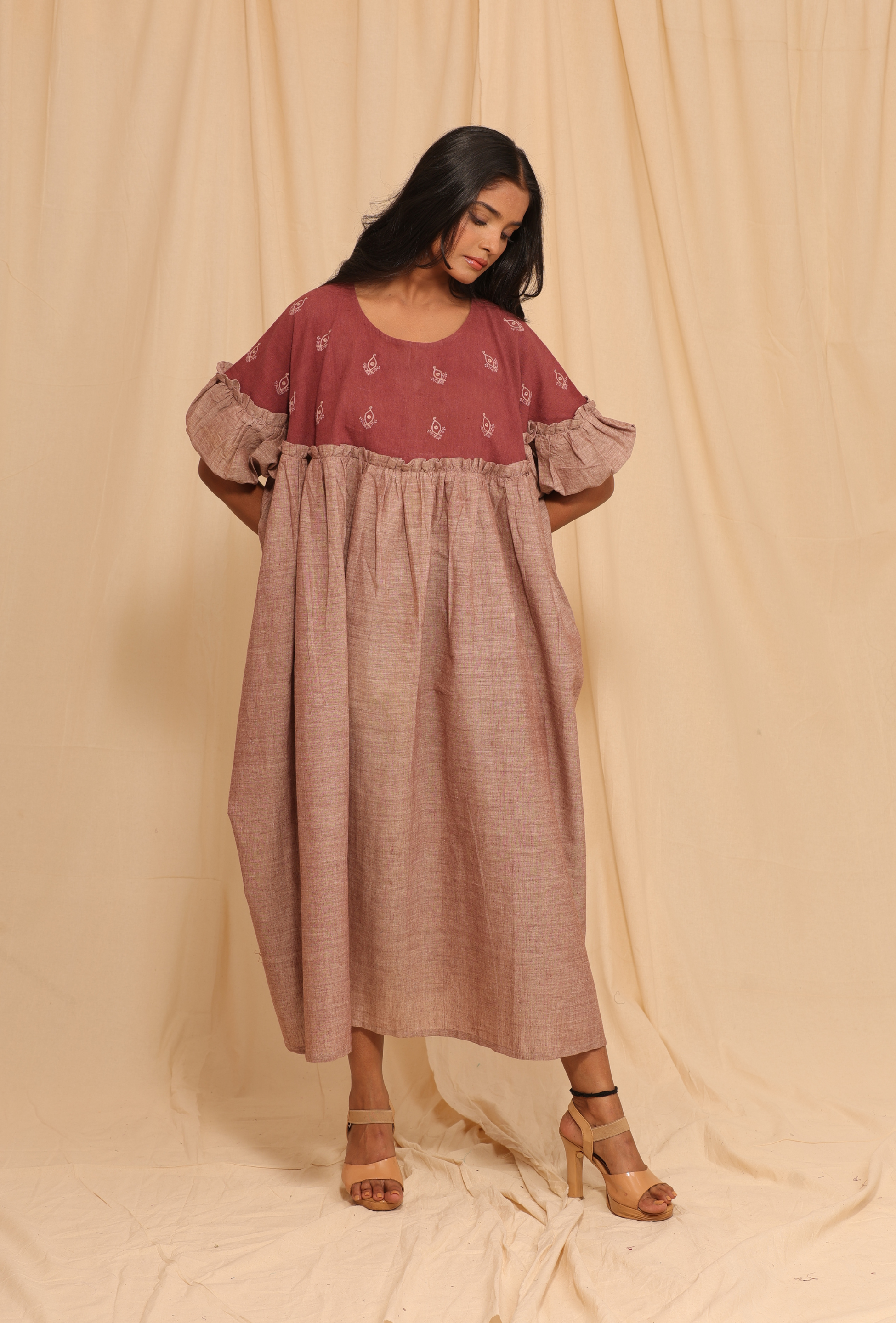 This mauve dress is designed for movement and ease. It features delicate hand embroidery and is tailored in naturally dyed organic cotton with handloom texture. The relaxed structure, earthy palette, and thoughtful detailing make it ideal for mindful wardrobes.