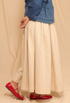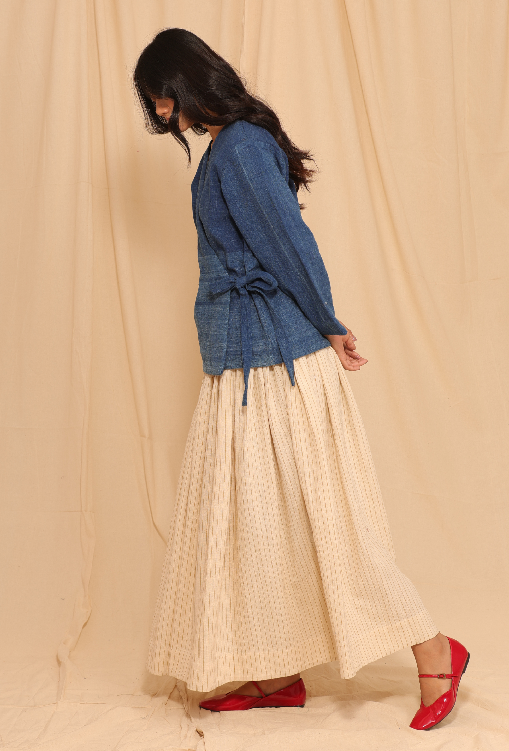 Breezy and bold, the Mustard Stripe skirt is crafted from handwoven Kala cotton, grown and spun in the artisan villages of Kutch. With its off-white base and mustard-toned stripes, the flared silhouette brings movement and lightness. The airy weave and breathable texture ensure ease on warm days, while its artisan roots make it a thoughtful wardrobe staple.